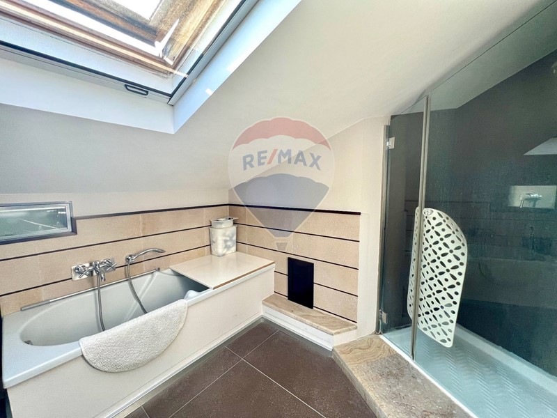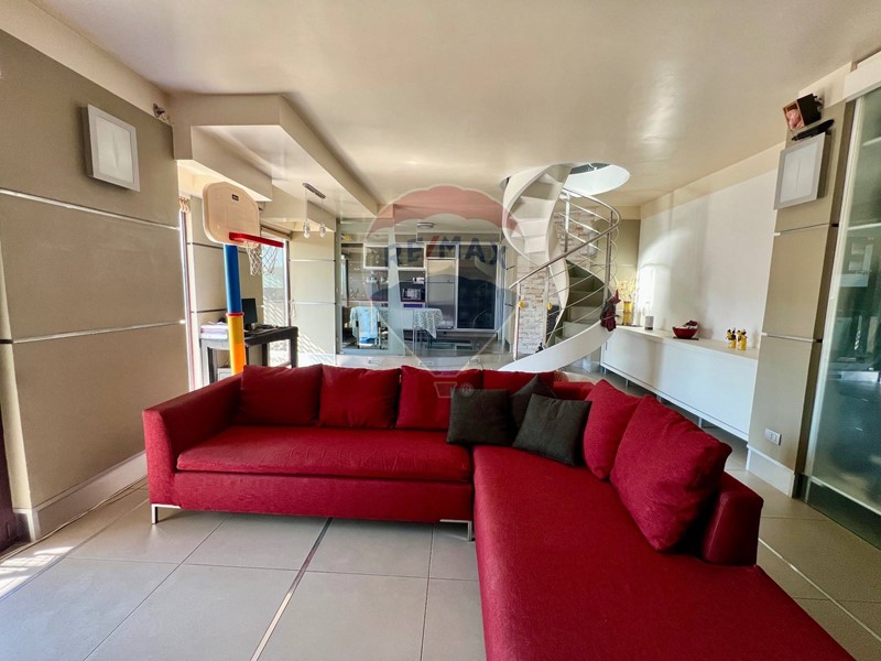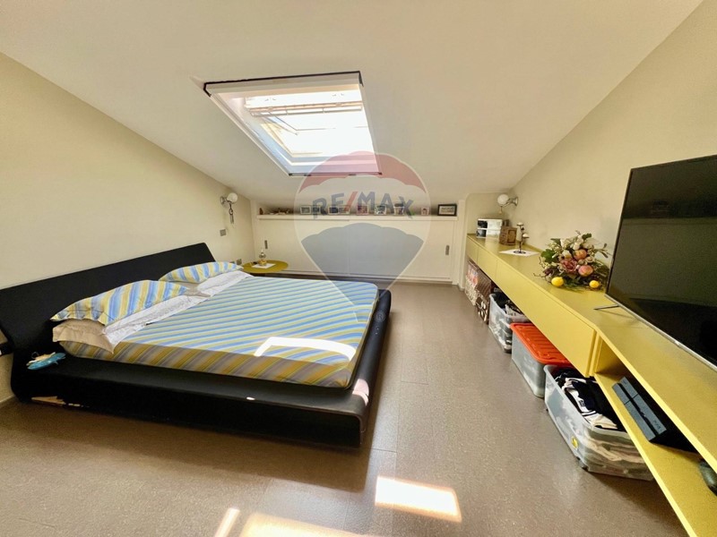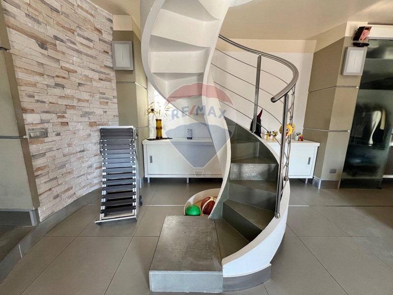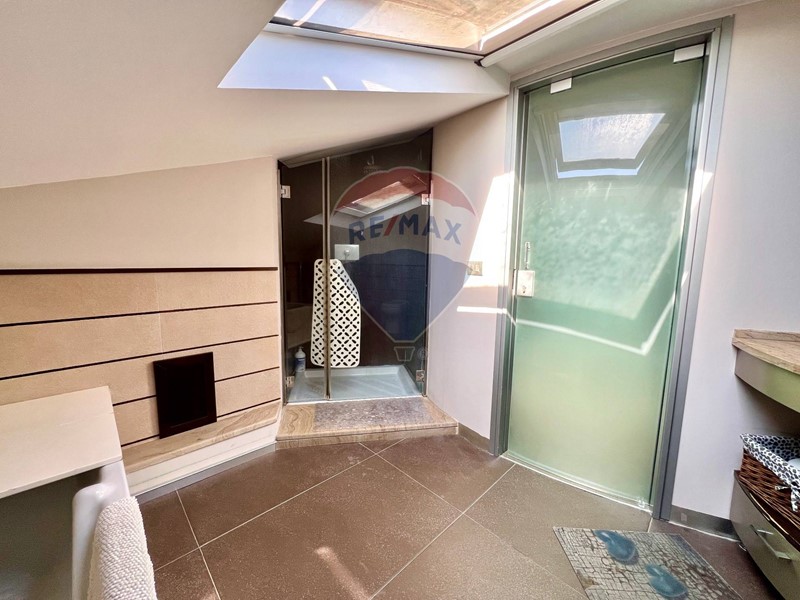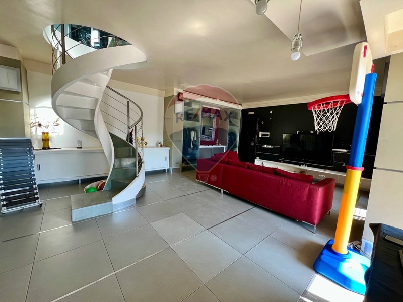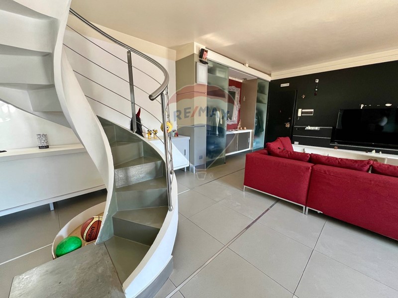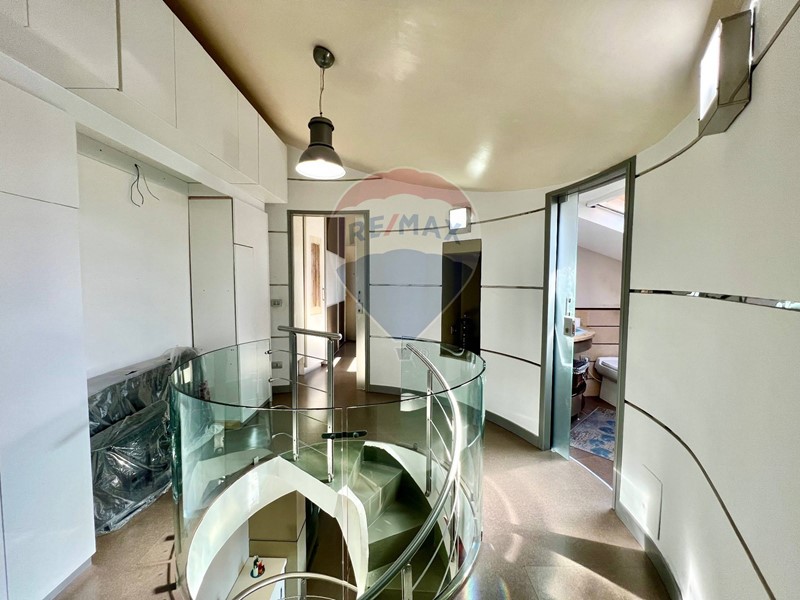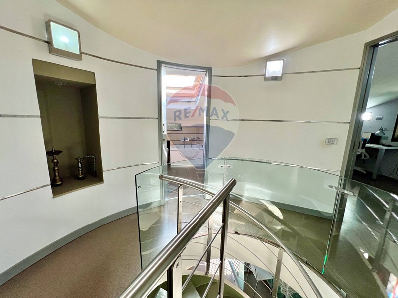 Una suggestiva scala a chiocciola di design conduce al piano superiore, dove si sviluppa la zona notte composta da una confortevole camera matrimoniale, una cameretta ed un secondo bagno finestrato, dotato sia di vasca che di doccia, pensato per il massimo comfort.