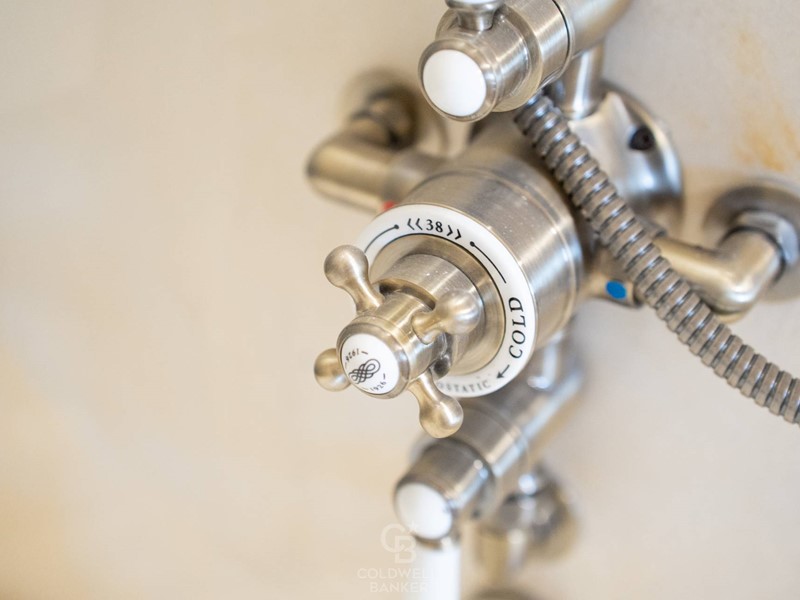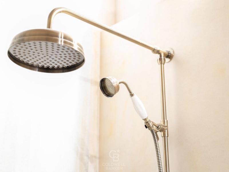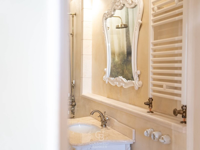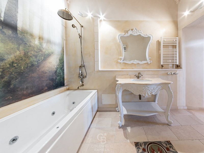 Nella stanza da bagno, al primo piano, sono presenti arredi di pregio: una vasca idromassaggio Jacuzzi, sanitari in porcellana, le rubinetteria in ottone e porcellana stile old England, una consolle Luigi Filippo stile Shabby Chic e si possono ammirare dei pannelli di Kerlite che raffigurano sulla parete il sentiero di un bosco.