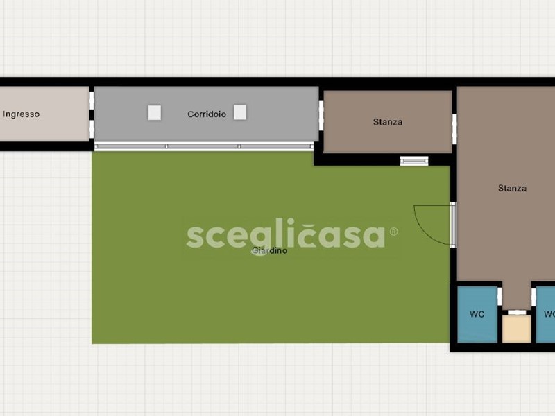 L'appartamento si presenta in ottimo stato ed è composto da un ampio ingresso , due ampie camere con vetrate che espongono direttamente sul giardino privato e due wc.