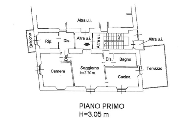 L'appartamento, al primo piano, è così strutturato: soggiorno, cucina abitabile con affaccio su ampio terrazzo, bagno finestrato con doccia, camera matrimoniale e ripostiglio con balcone.
