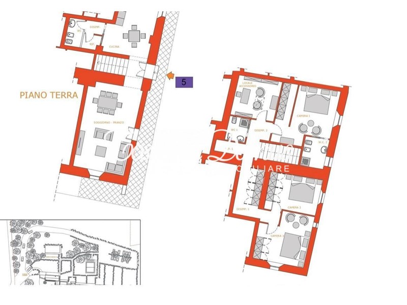 L''immobile in oggetto in oggetto e' raffigurato con il numero 5 ( raffigurato nel colore viola) nella piantina allegata e vanta una metratura di mq 194 disposto su due livelli a piano terra composta da ingresso, cucina ampio soggiorno con accesso a giardino privato di 190 mq, bagno.