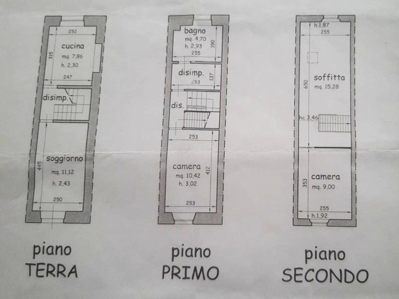 il terratetto al suo interno è così composto: piano terreno ingresso in soggiorno, disimpegno con piccolo ripostiglio sottoscala, cucina; al piano primo da camera di 10mq e bagno; al piano secondo a cui si accede con scala in legno altra camera singola e soffitta in cui poter ricavare una terza camera da letto.