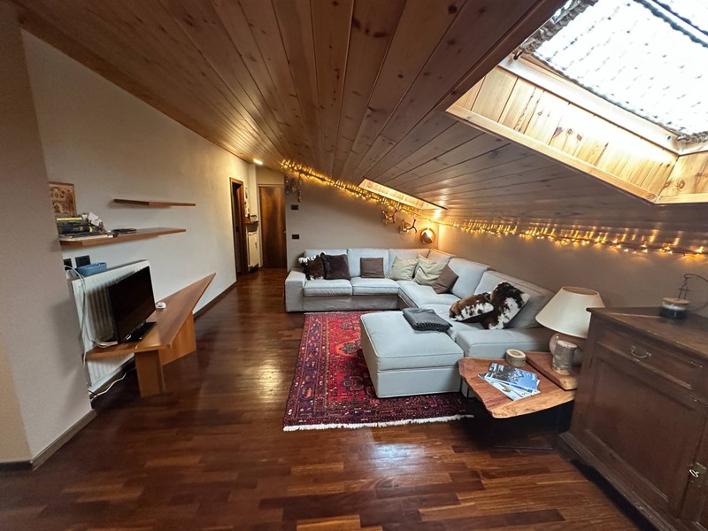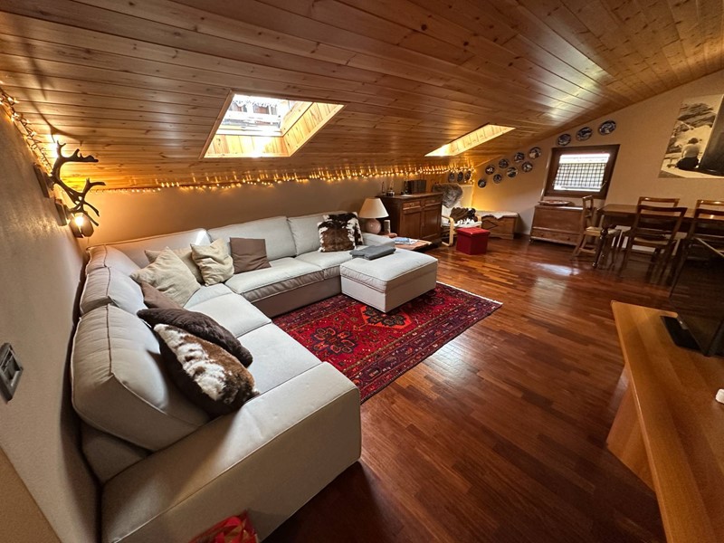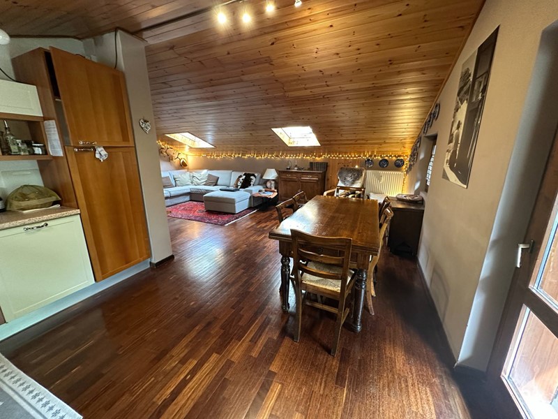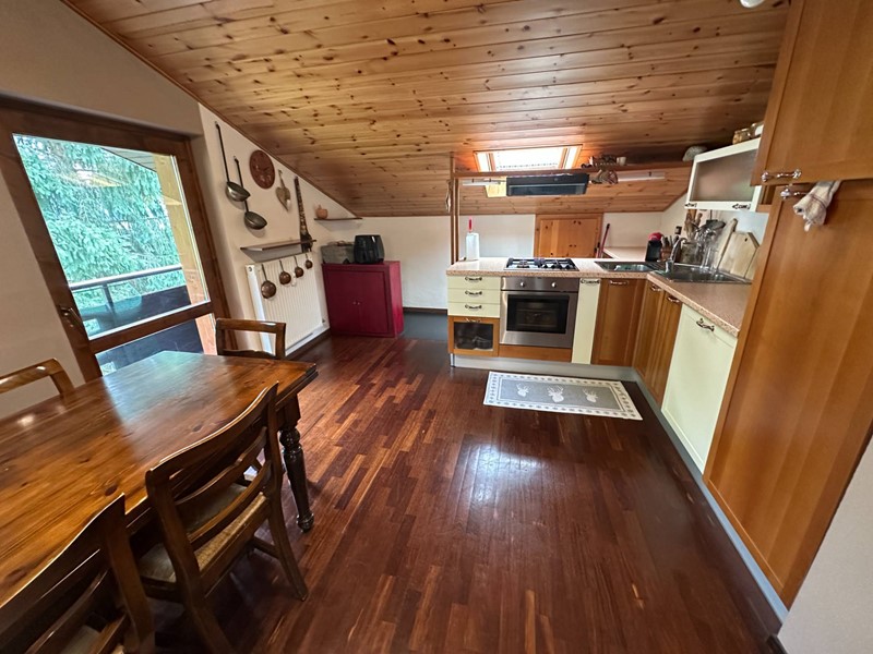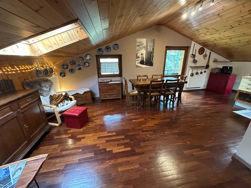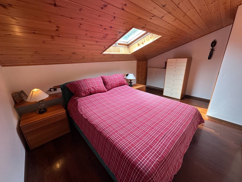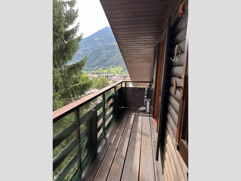 A Giustino, sul confine con Pinzolo, ampia mansarda trilocale al terzo piano con un poggiolo esposto a sud molto luminosa.