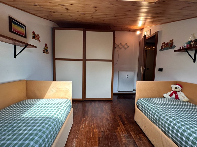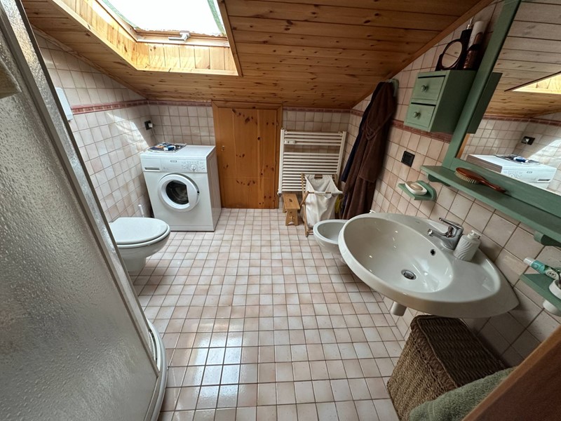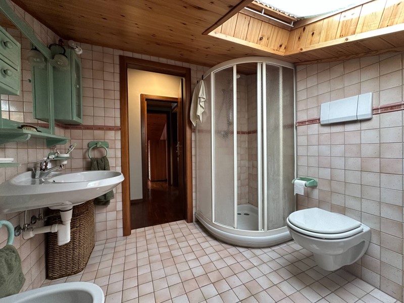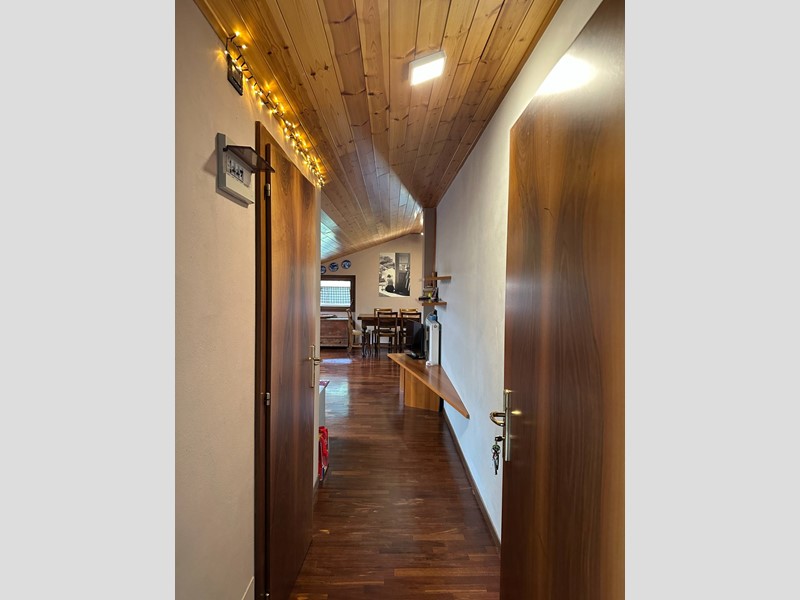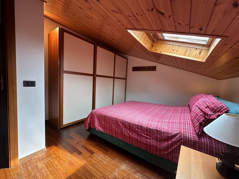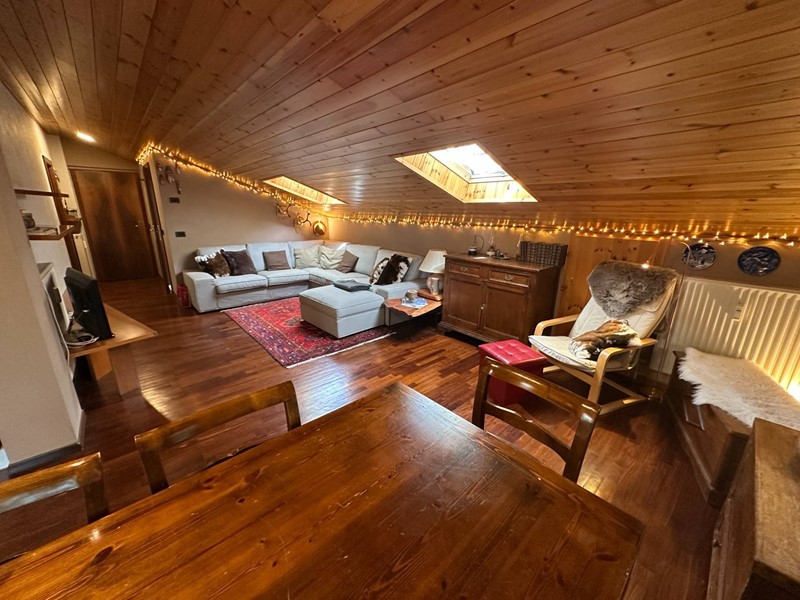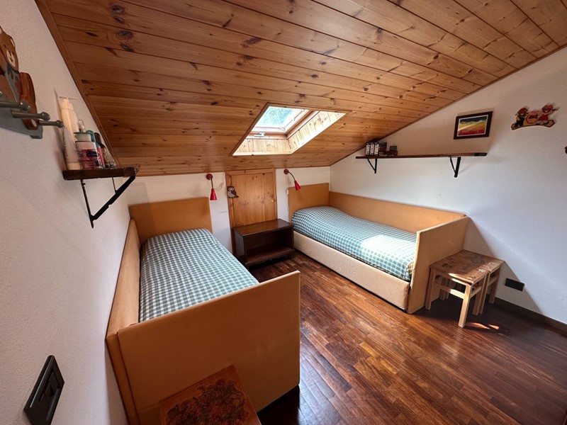A Giustino, sul confine con Pinzolo, ampia mansarda trilocale al terzo piano con un poggiolo esposto a sud molto luminosa.