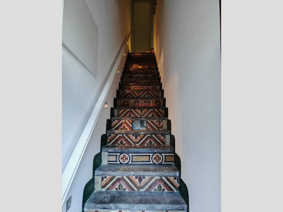 Al primo piano, raggiungibile da una suggestiva scalinata in pietra pece e ceramica colorata, si trova un secondo loft, leggermente più raccolto ma altrettanto raffinato. Anche qui troviamo un moderno open space living con salotto e cucina a penisola, un balcone con vista su Ibla, una camera da letto su soppalco con bagno privato, oltre a un secondo bagno e un angolo lavanderia.