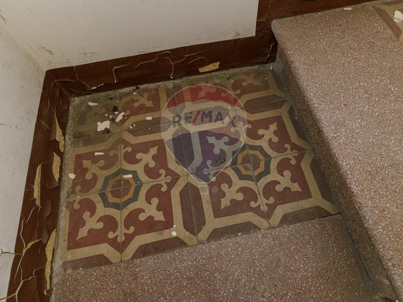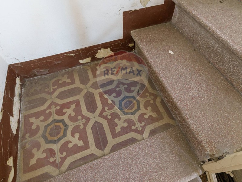 Scala interna con ringhiera in ferro battuto e pavimentazione in cementine.