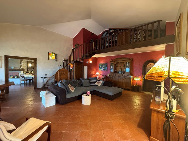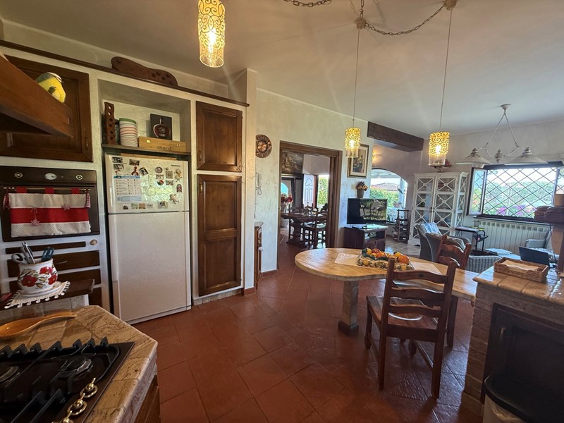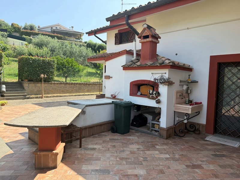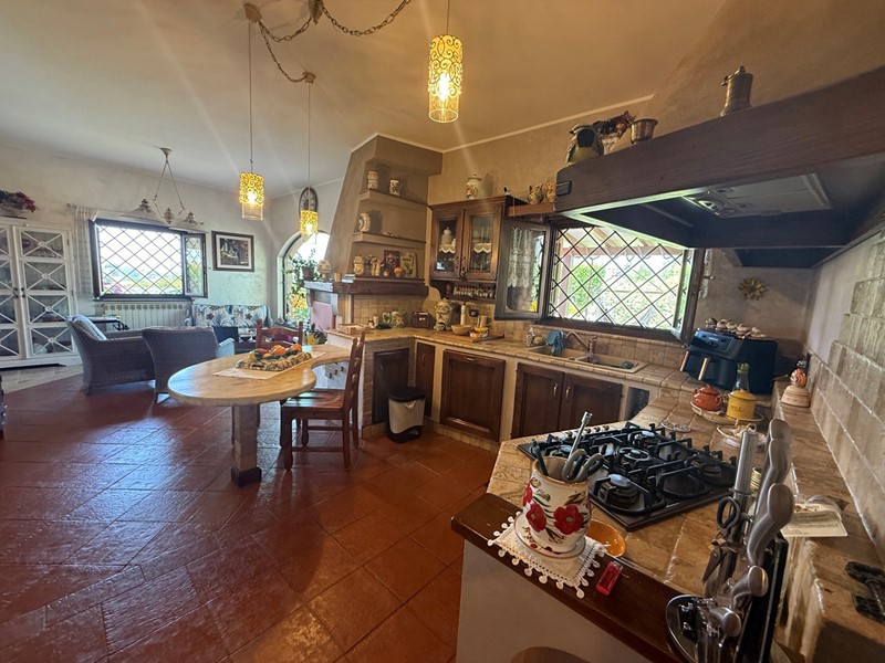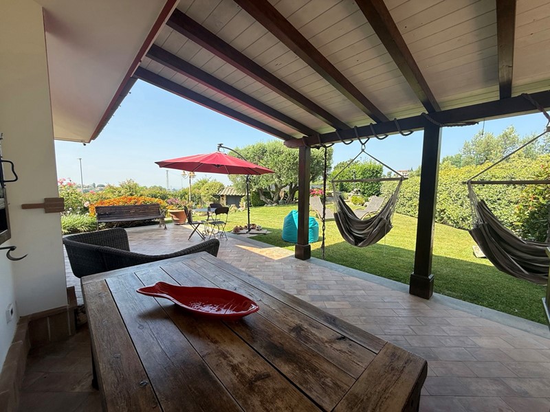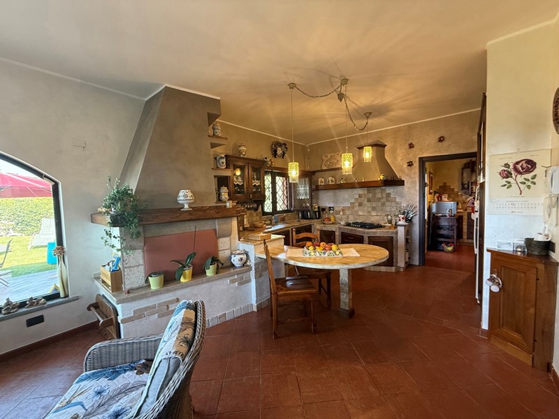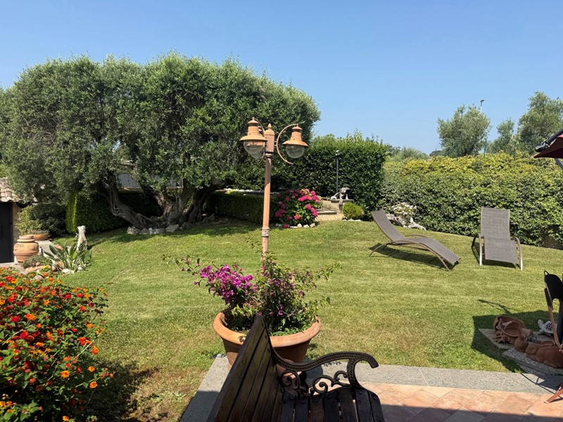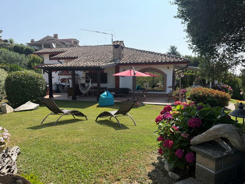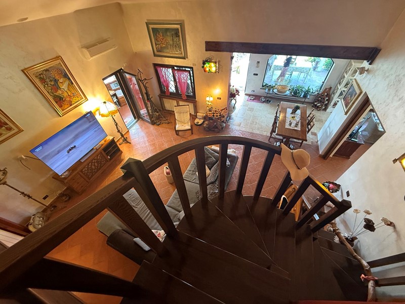 La villa padronale ha l'accesso, sia pedonale che del box doppio, direttamente da Via degli Ulivi, ed è dislocata principalmente su un unico livello al piano terra, di totali mq 190, ed è composto da: ampio salone di rappresentanza con grande cucina abitabile in muratura a vista e camino, dotata di ampie vetrate blindate con affaccio sul giardino, dispensa con accesso diretto al giardino sulla zona barbecue/forno a legna in muratura, portico verandato adibito a palestra con piccolo magazzino adibito a lavanderia, corridoio che divide e collega la zona giorno dalla zona notte, dotato di armadi a muro da entrambi i lati, camera padronale con bagno interno in muratura e vasca idromassaggio, seconda camera matrimoniale e bagno con doccia; il piano primo sottotetto, d totali mq 44, accede da una comoda ed elegante scala in legno, dove troviamo una balconata che affaccia sulla sala attualmente è adibita a piccolo studio, una grande camera doppia con altezza 2,33, ed un bagno con doccia, oltre dei vani sottotetto ad uso ripostiglio. Il box di mq 42, ha l'accesso direttamente su strada da una bascula in legno elettronica, è dotato di acqua, luci di emergenza e portone blindato interno per accedere direttamente nella proprietà. A completare la bellissima zona esterna, dove troviamo un porticato in legno su 3 lati e un incantevole giardino di circa mq 1.700, curato ed attrezzato in ogni minimo dettaglio, dotato di terrazza/solarium ed un bagno esterno con doccia, una vera oasi di relax, pace e tranquillità.