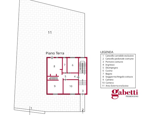 - 1 livello (piano terra): ingresso con porta di caposcala, disimpegno, cucina, bagno, due camere, soggiorno/angolo cottura con camino ed uscita su area esterna di esclusiva proprietà, di 790 mq, in parte pavimentata ed in parte adibita a giardino;