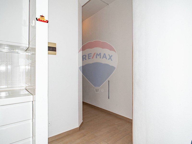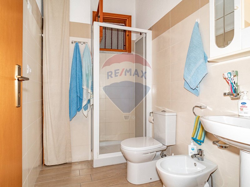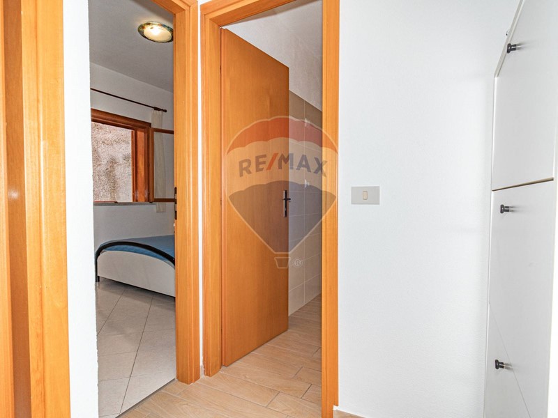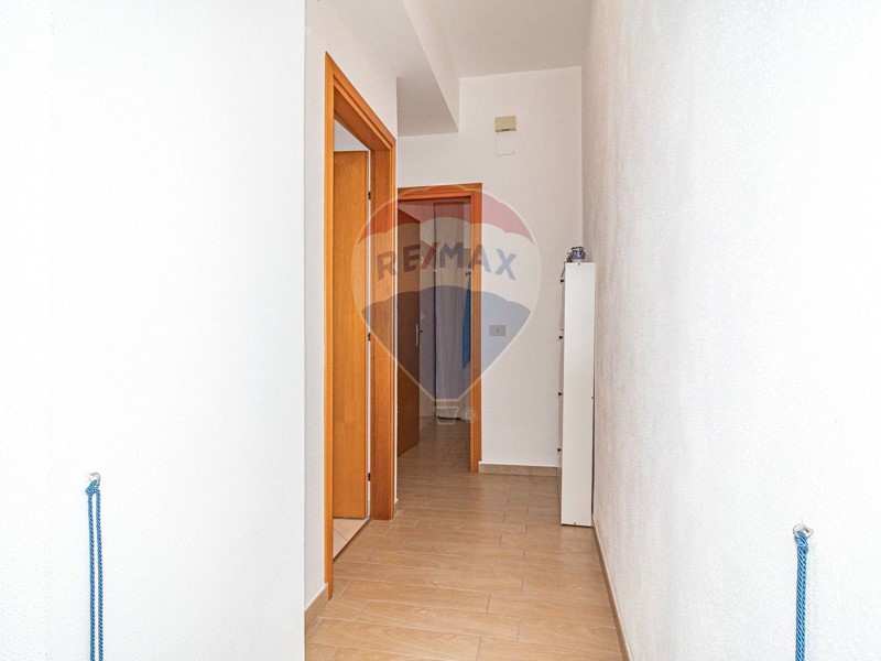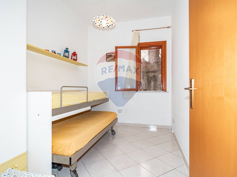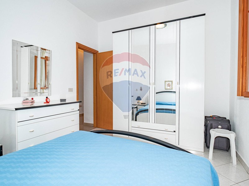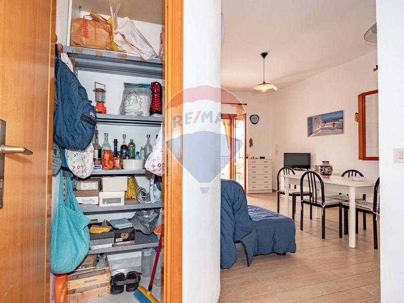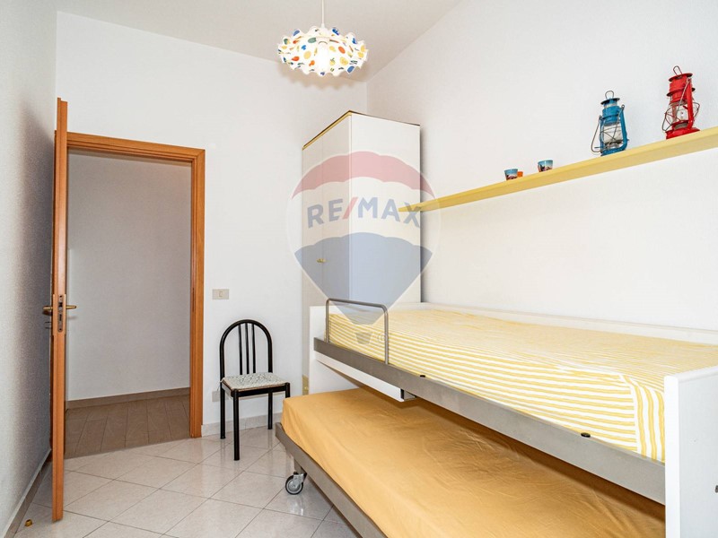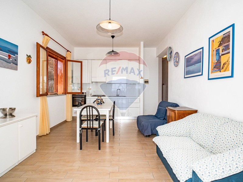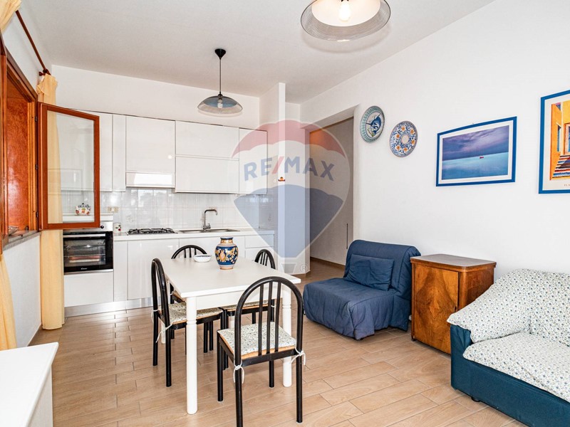 L'appartamento è composto da un ampio e luminoso soggiorno-pranzo con angolo cottura, un disimpegno, uno sgabuzzino, due camere da letto e un bagno. L'ampia terrazza offre una vista mare straordinaria e l'immobile, venduto totalmente arredato, gode anche della proprietà di un posto auto riservato presso gli spazi esterni del cortile condominiale.