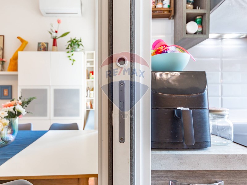 La zona living (c.ca 20 mq) è abbastanza spaziosa da ospitare un comodo divano e un'area pranzo e la cucina separata con finestra, completamente arredata con mobili moderni e funzionali. La zona è dotata di balcone con affaccio sul cortile interno, esposto a sud.