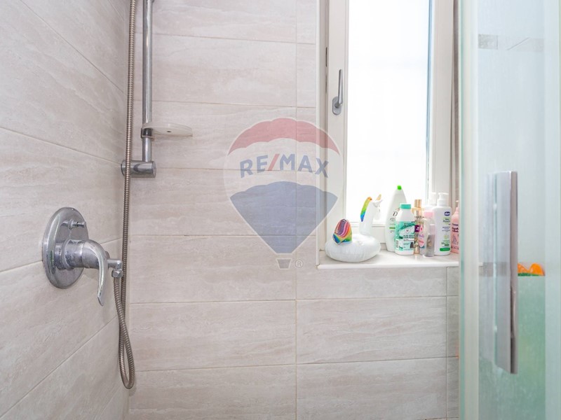Il bagno è dotato di ampia doccia e finestra, arredato con mobili moderni.