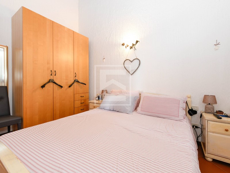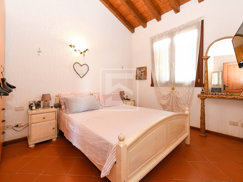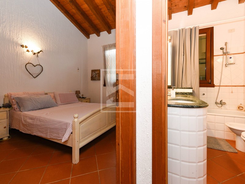 Nella zona notte, separata dalla zona giorno da disimpegno, troviamo due camere da letto e il bagno finestrato con vasca. Travi a vista in tutta la casa.