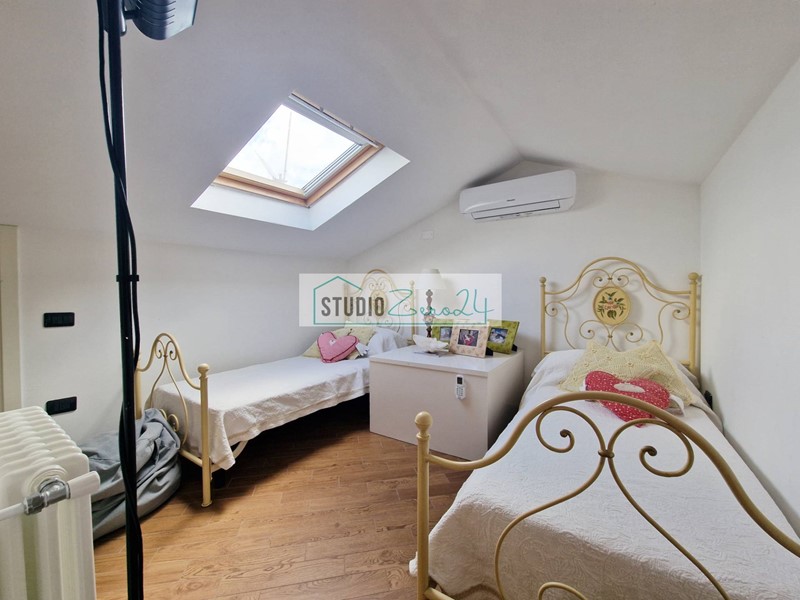 Il primo piano ospita un appartamento di circa 130 mq, altrettanto ampio e luminoso, composto da una bella zona living con soggiorno e sala, cucina abitabile, due camere matrimoniali di cui una con bagno privato con doccia idromassaggio, un secondo bagno con vasca idromassaggio, stanza armadi, ripostiglio e una zona sottotetto attualmente utilizzata come ulteriore camera. Completano la proprietà una terrazza vivibile e un secondo giardino esclusivo di circa 300 mq con posti auto, oltre allimpianto di aria condizionata.