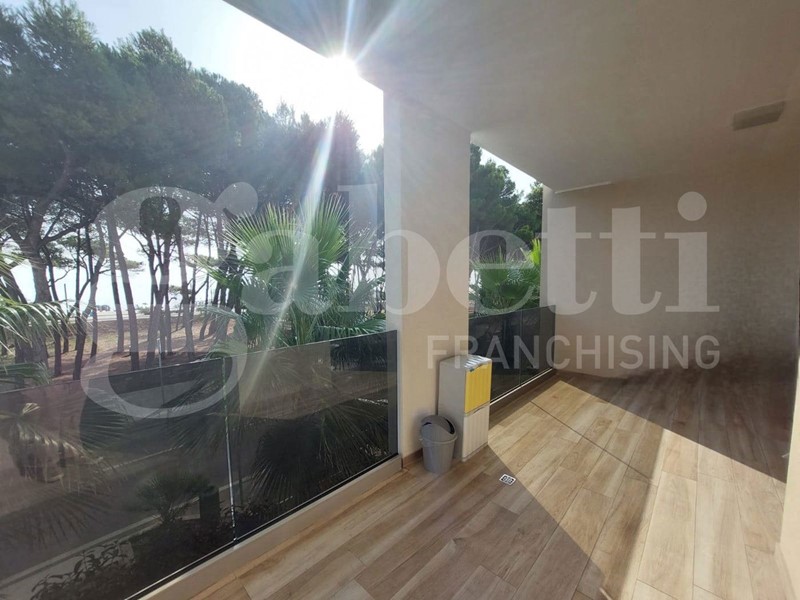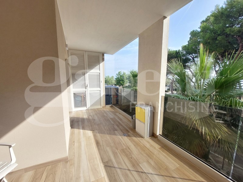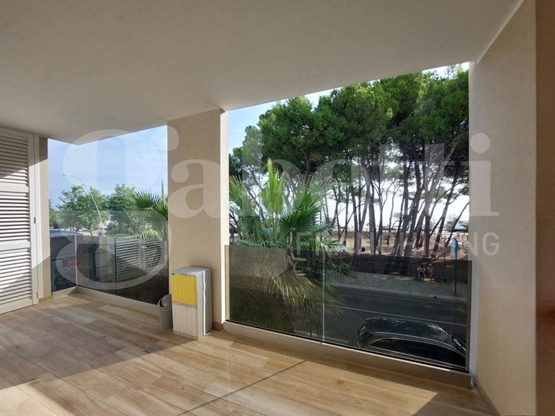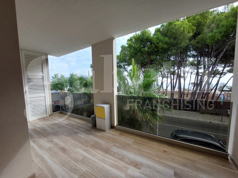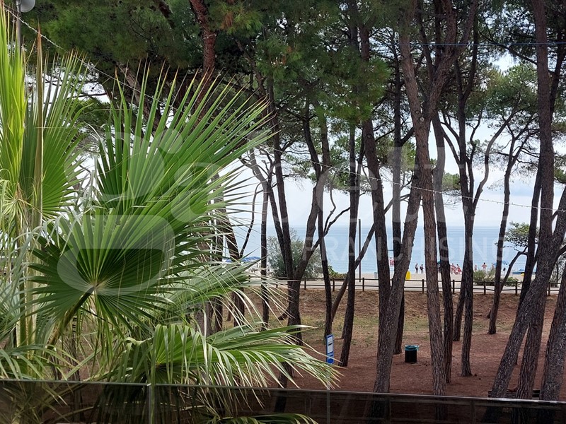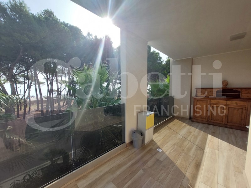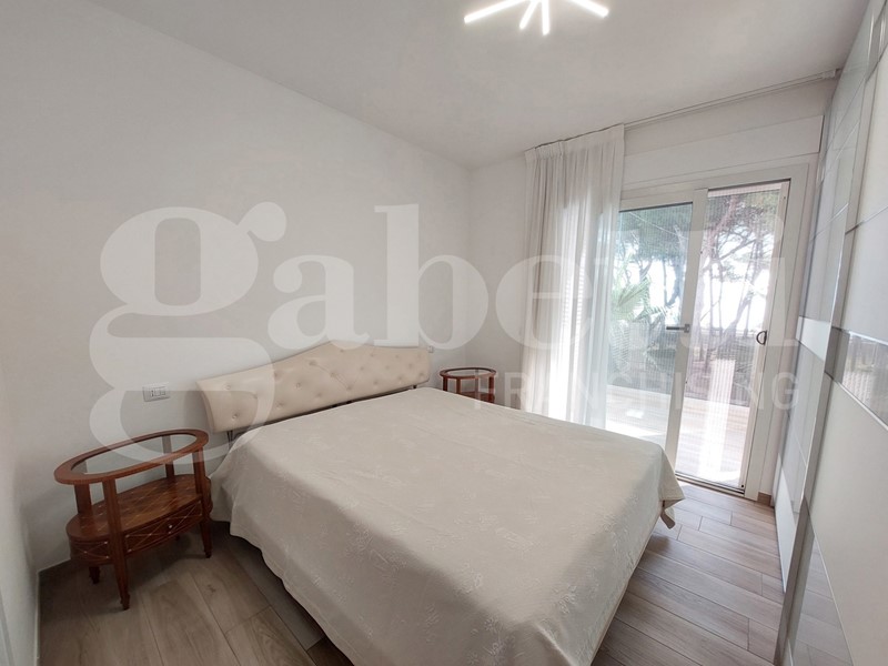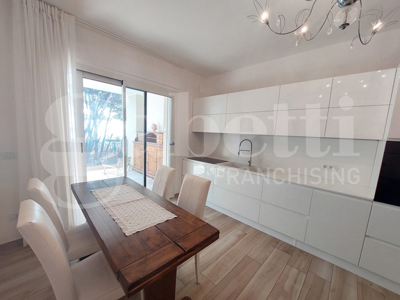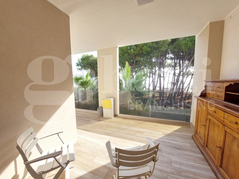 L'appartamento, arredato con gusto e cura dei dettagli, accoglie gli ospiti con un luminoso soggiorno che si affaccia su un ampio terrazzo con vista mozzafiato sul mare e sulle pinete circostanti. La cucina a vista, moderna e funzionale, è il cuore pulsante della zona giorno, ideale per momenti conviviali e di relax.