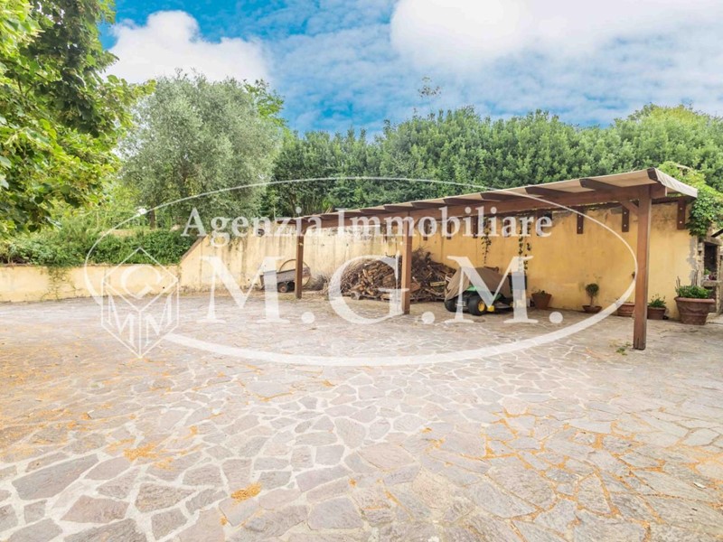 Il giardino, oltre a offrire uno spazio ideale per la realizzazione di una piscina, comprende: un grande garage, uno spazio piastrellato adibito a parcheggio e un loggiato dove poter trascorrere il tempo libero.