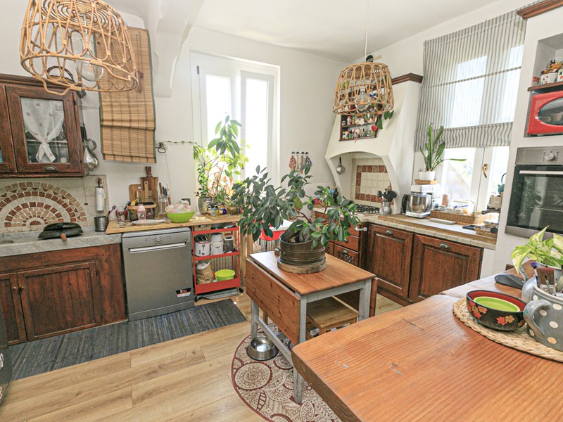 La proprietà si sviluppa su tre livelli, con ingresso indipendente, parcheggio e giardino privato. L’appartamento principale si trova al primo piano ed è stato ristrutturato di recente: gli ambienti, moderni e funzionali, hanno conservato il fascino dell’edificio storico. Qui troviamo un’accogliente zona giorno, la cucina, due camere da letto e un bagno.