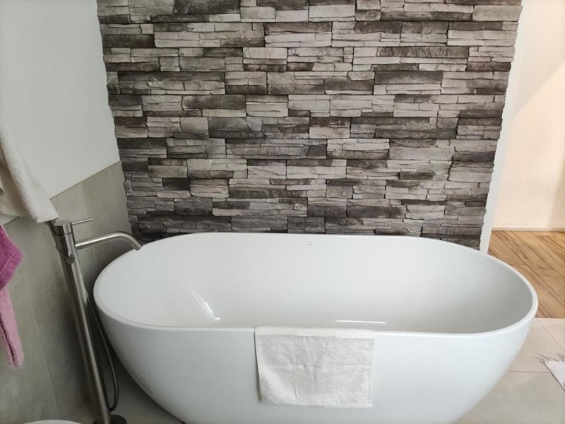 un grande bagno finestrato, elegante e funzionale, con vasca e doccia.