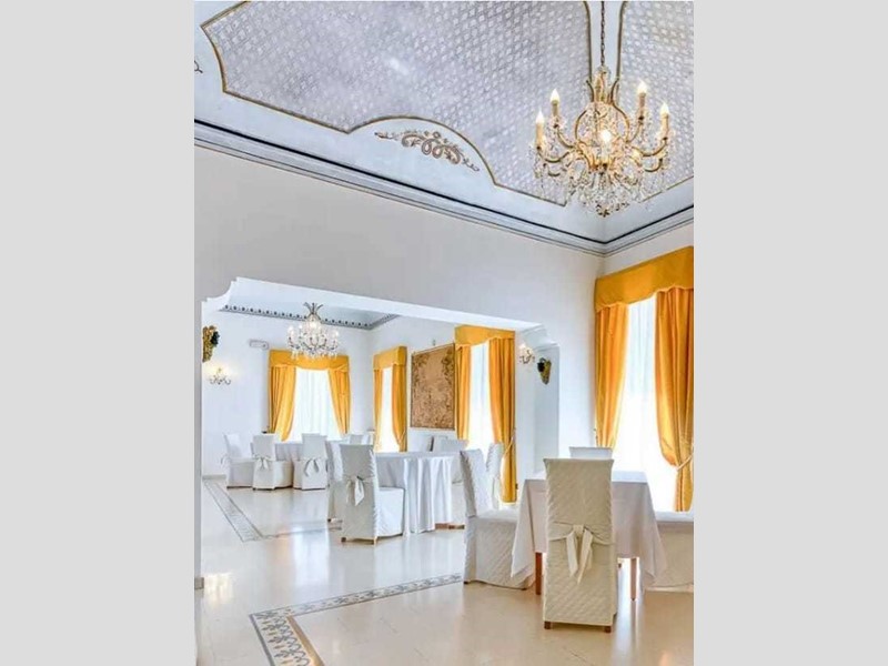 Al primo piano del corpo principale si estendono sale affrescate per 380 mq e un terrazzo fronte mare di 65 mq.
