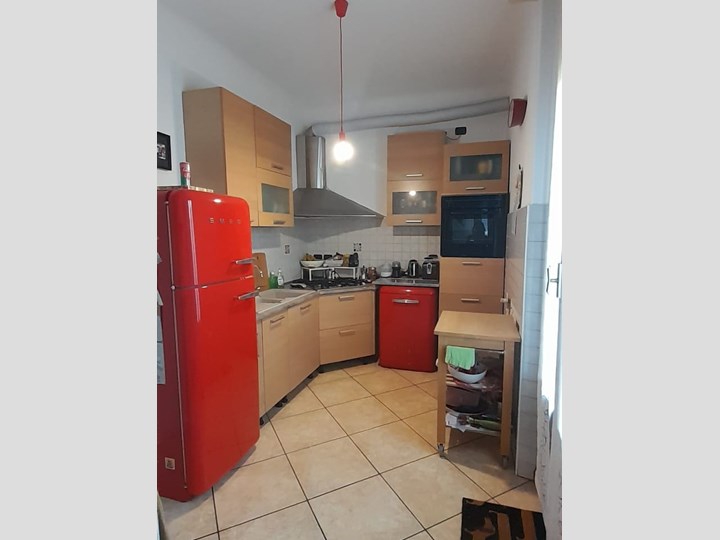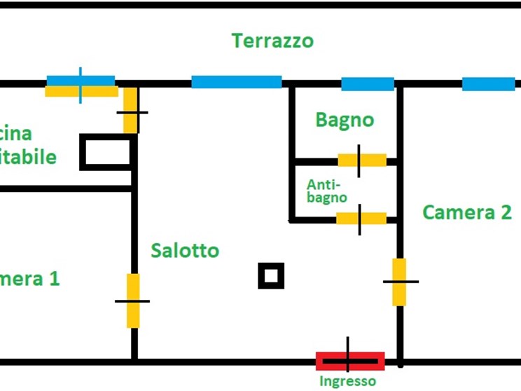 2 grandi stanze + salotto/sala da pranzo + cucina abitabile, bagno diviso (lavabo + alloggiamento lavatrice; vasca/doccia e sanitari).