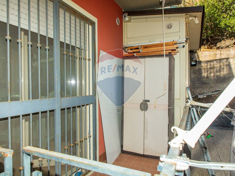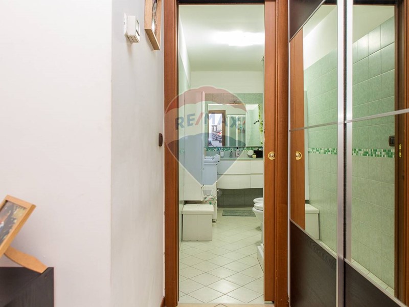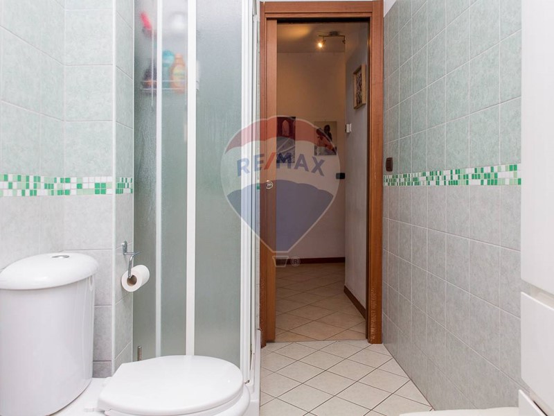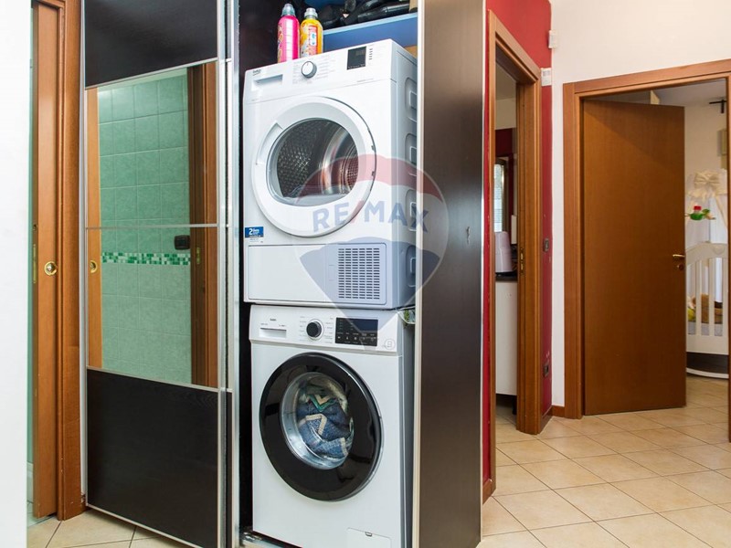 Il bagno, ampio e funzionale, è dotato di doccia ed è preceduto da una pratica armadiatura che ospita lavatrice, asciugatrice e zona ripostiglio. La camera matrimoniale gode di affaccio sulla terrazza ed è dotata di balconcino di dimensioni standard.