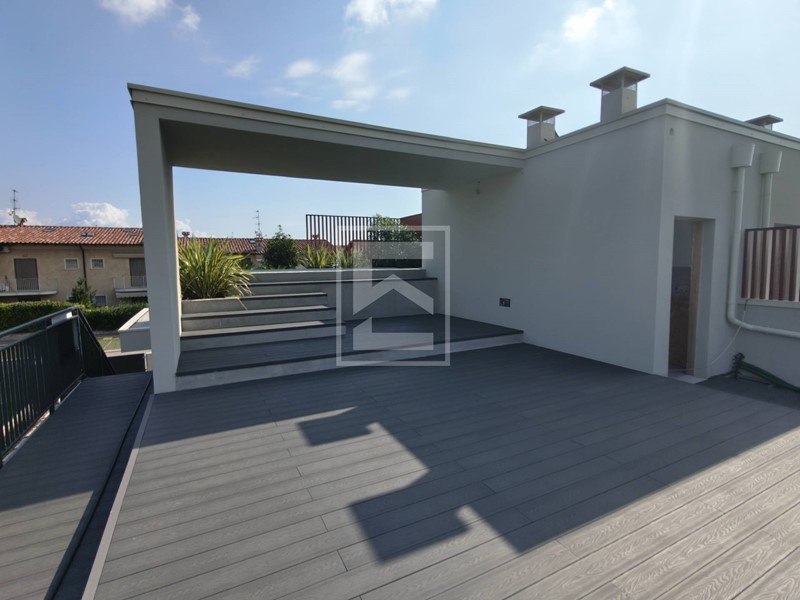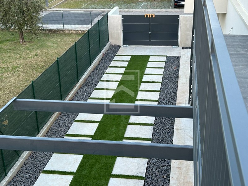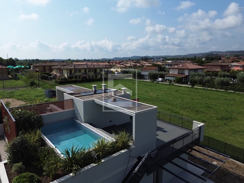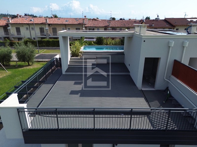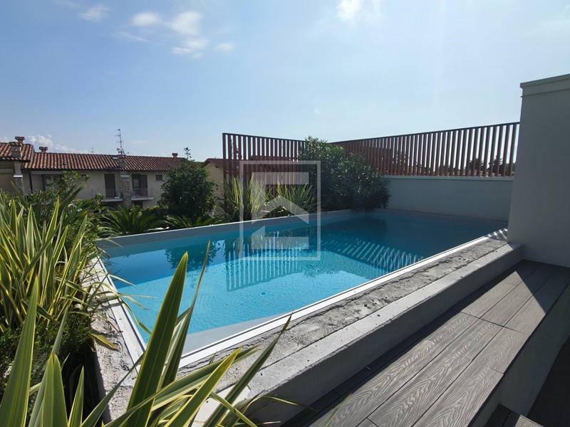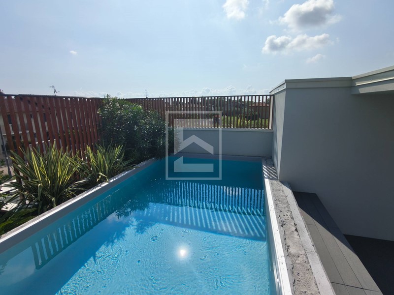 Una scala esterna porta alla zona tetto, nella quale è stato ricavato un giardino pensile con piscina e solarium, zona spogliatoio e servizi.