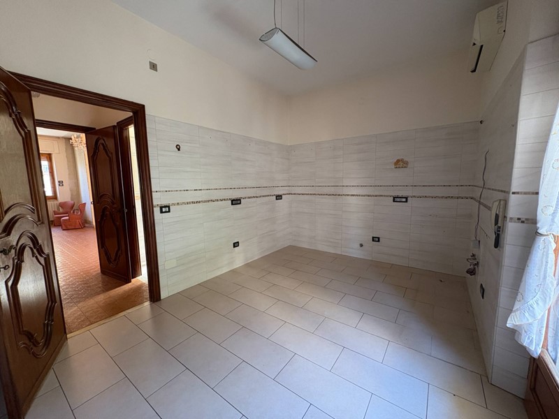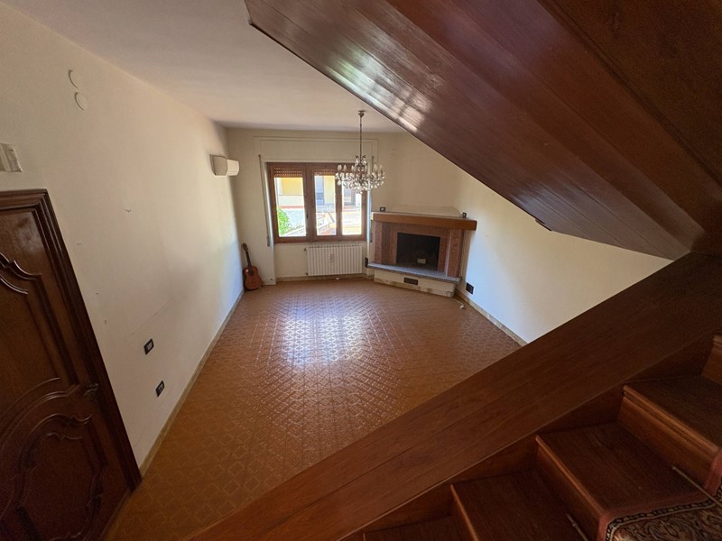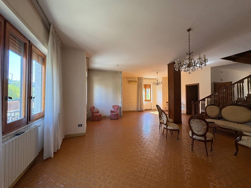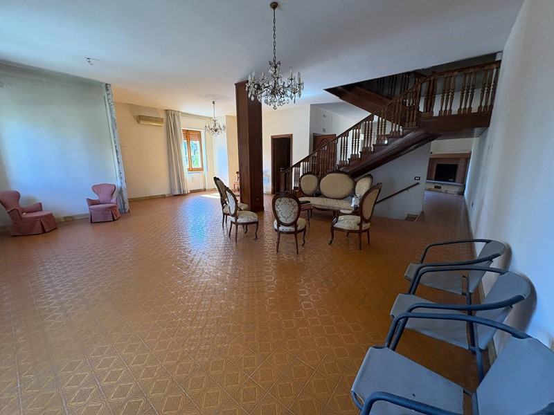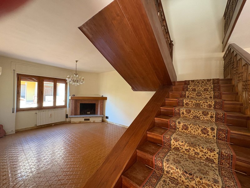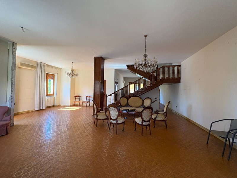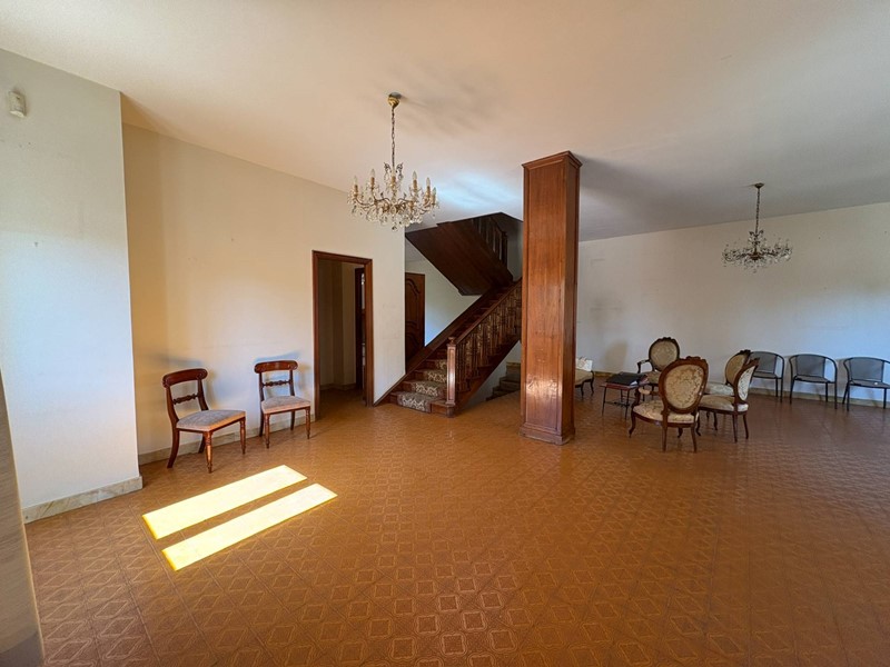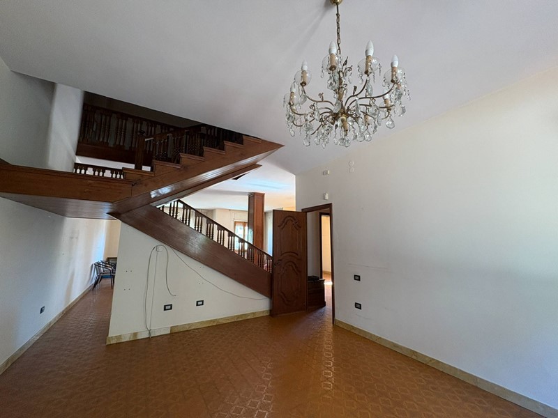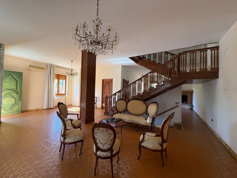 Al piano rialzato attraverso un portico dingresso si accede ad un ampio salone di circa 90 mq. finestrato per due lati. Nel salone è presente un imponente scala, con pedate e ringhiere in legno massello, ed un camino. Proseguendo troviamo una cucina abitabile con un spazioso terrazzino con affaccio sul giardino e un bagno completo.