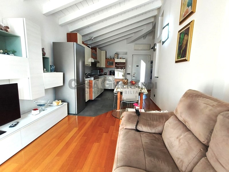 La zona giorno accoglie con un ampio soggiorno con angolo cottura caratterizzato da travi a vista e grandi finestre affacciate sul terrazzo vivibile di 16 mq, dotato di tende da sole. La zona notte comprende una camera anch’essa con affaccio sul terrazzo, un bagno generoso con doccia e vasca idromassaggio con affaccio su di un balconcino un angolo lavanderia e un piccolo studio mansardato, perfetto come zona lavoro o hobby.
