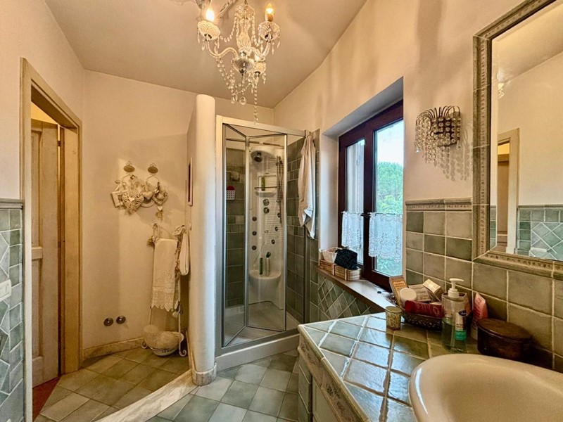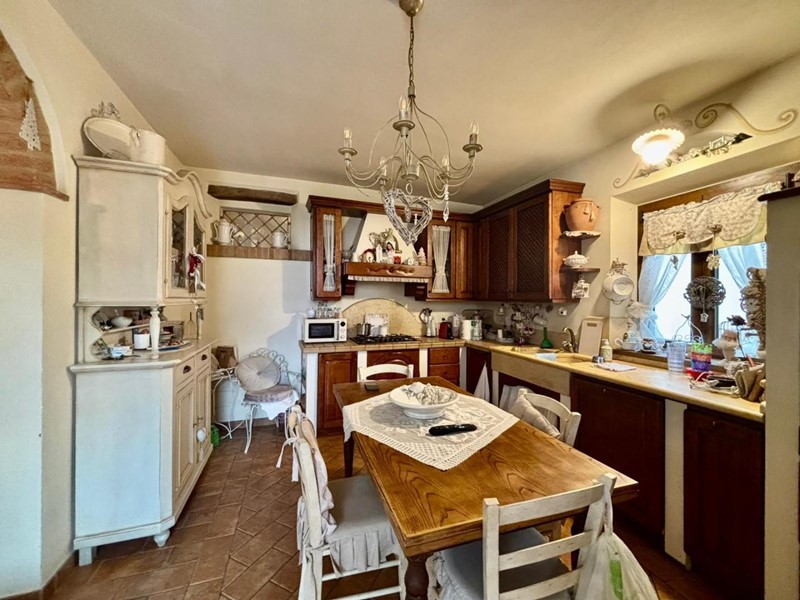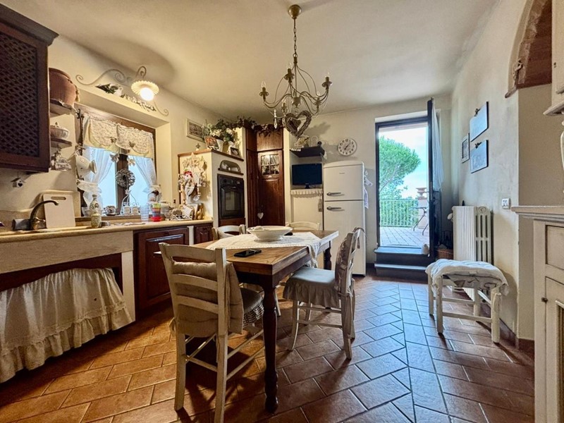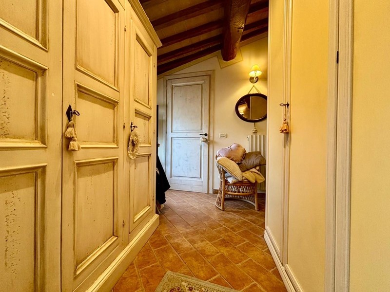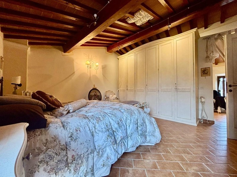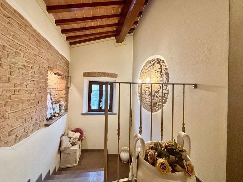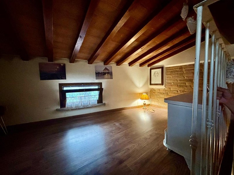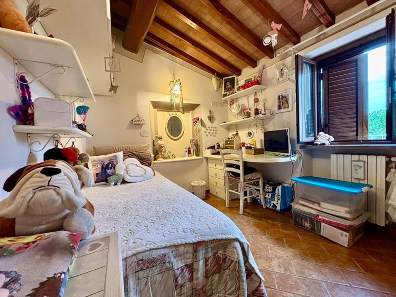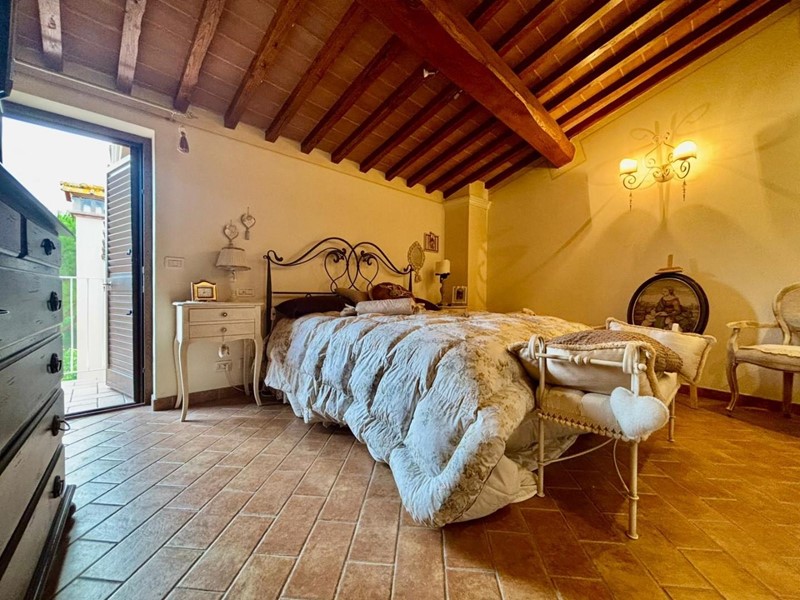 Salendo al piano primo domina un elegante soggiorno con camino autentico in stile toscano, una cucina abitabile in muratura con accesso diretto sulla bellissima terrazza, luogo ideale dove poter trascorrere piacevoli momenti di relax, ed un ulteriore bagno con doccia e un affascinante e tipica mansarda oggi adibita a studio.