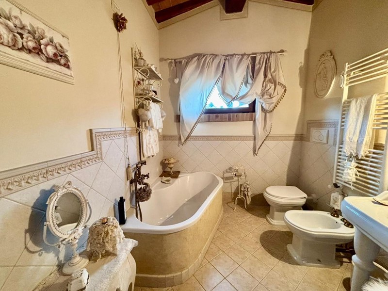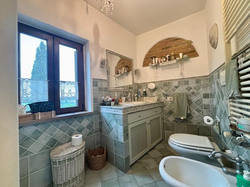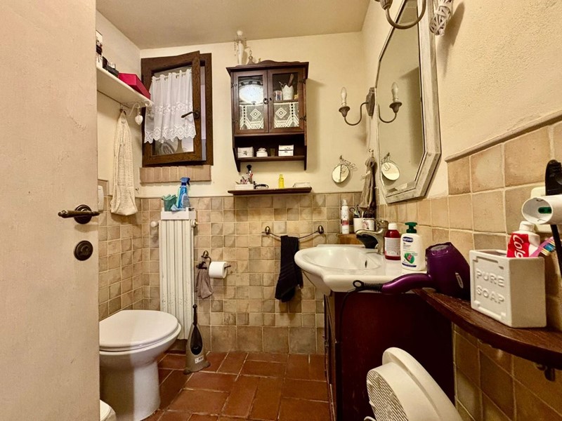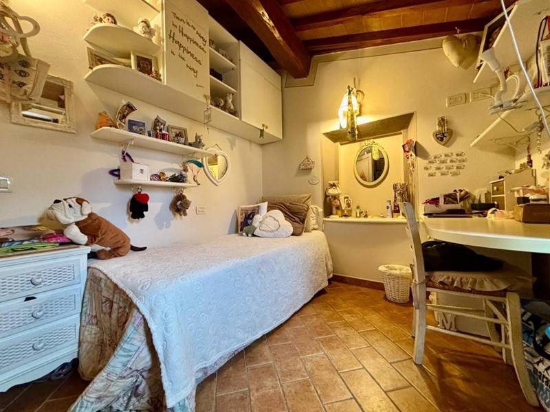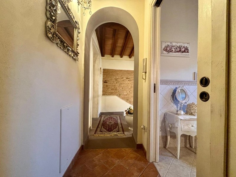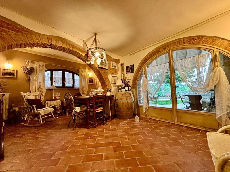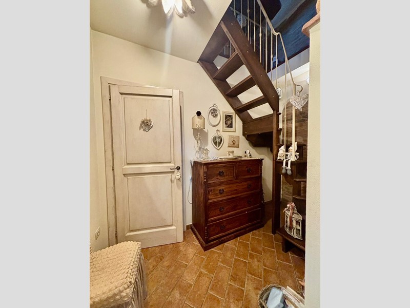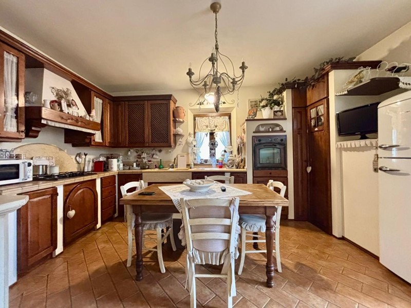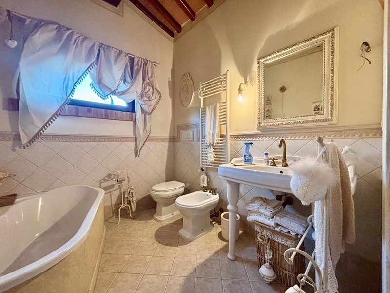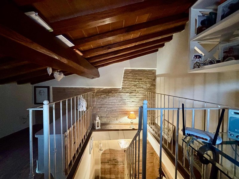 Salendo al piano primo domina un elegante soggiorno con camino autentico in stile toscano, una cucina abitabile in muratura con accesso diretto sulla bellissima terrazza, luogo ideale dove poter trascorrere piacevoli momenti di relax, ed un ulteriore bagno con doccia e un affascinante e tipica mansarda oggi adibita a studio.