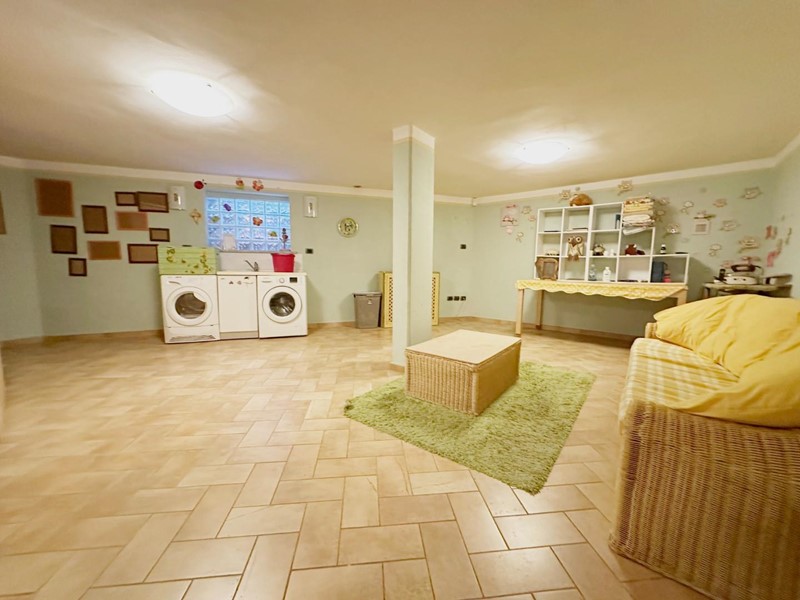 Il piano seminterrato accoglie una grande taverna con cucina in muratura e caminetto, un vano pluriuso con angolo lavanderia, un ulteriore bagno e un ampio garage capace di ospitare più auto.