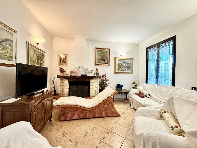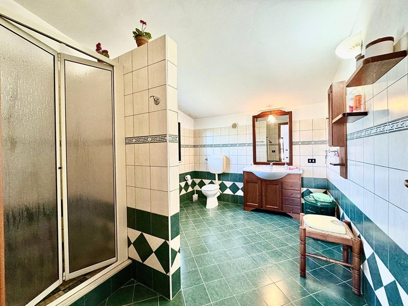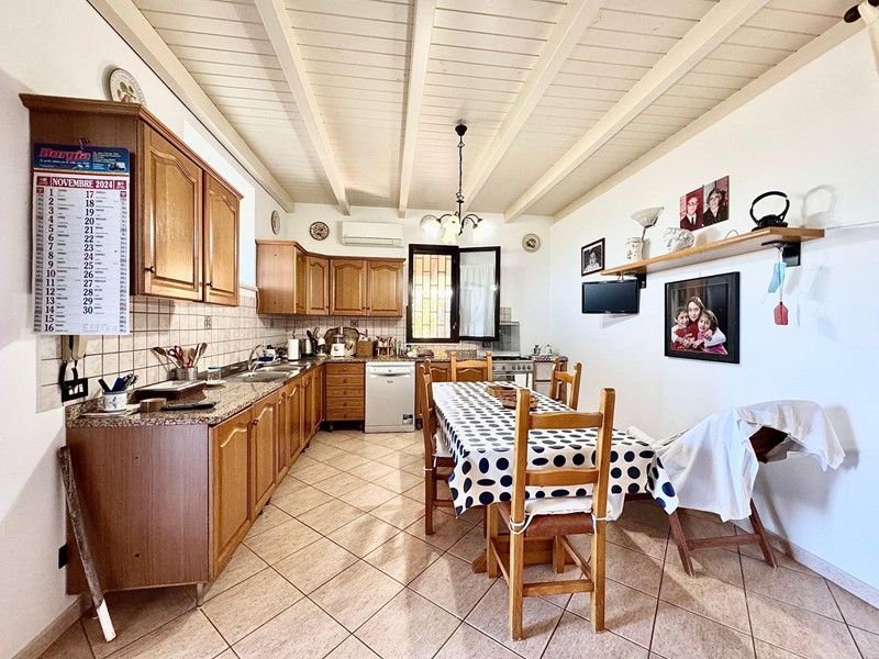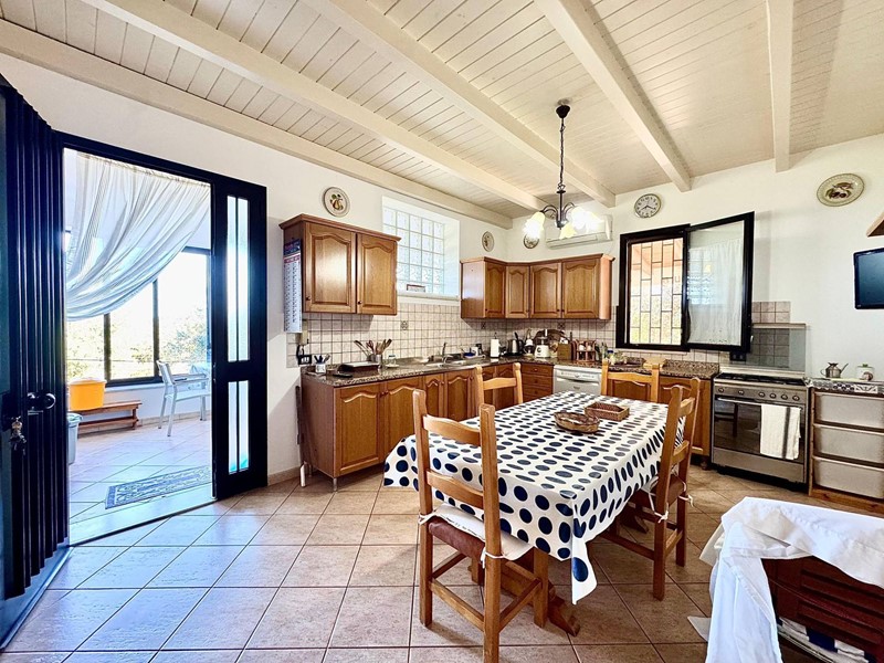 Dalla veranda, si accede a una cucina abitabile con soffitto a vista in legno. Adiacente si sviluppa una prima zona notte con una camera da letto e un bagno. Dalla cucina si accede direttamente al grande salone con camino, seguito da altre due camere da letto e da un ulteriore bagno con finestra.