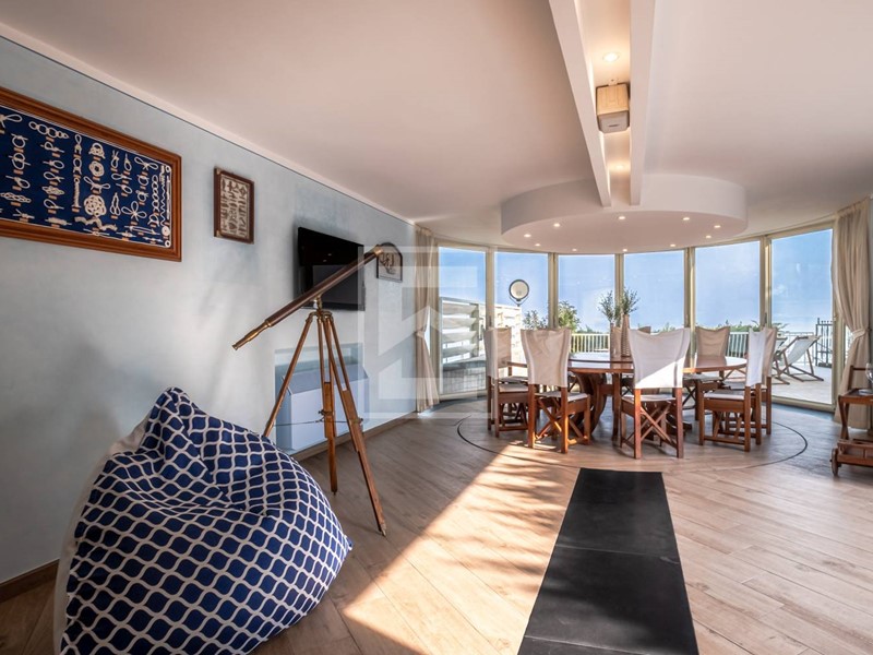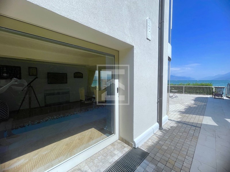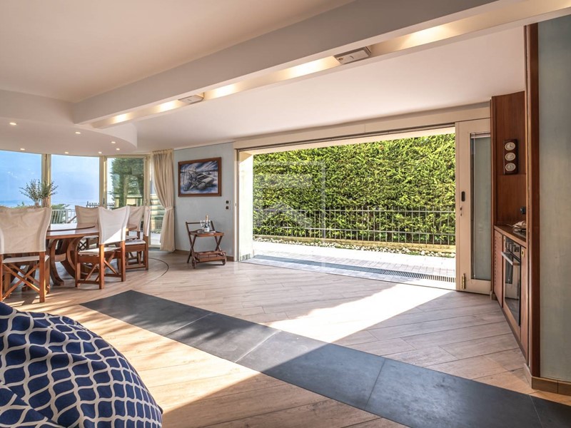 Il piano terra ospita una generosa living romm, attrezzata di cucina con arredamento da "barca" e un importante tavolo con pedana rotante per garantire ad ogni commensale l'esclusivita' di poter pasteggiare godendo dell'incantevole vista su Sirmione e sul golfo di Desenzano, affacciata completamente sul lago e sull'ampia terrazza per godere degli scenari suggestivi che il lago regala a seconda dei momenti della giornata; il bagno di cortesia completa il piano.
