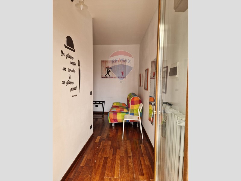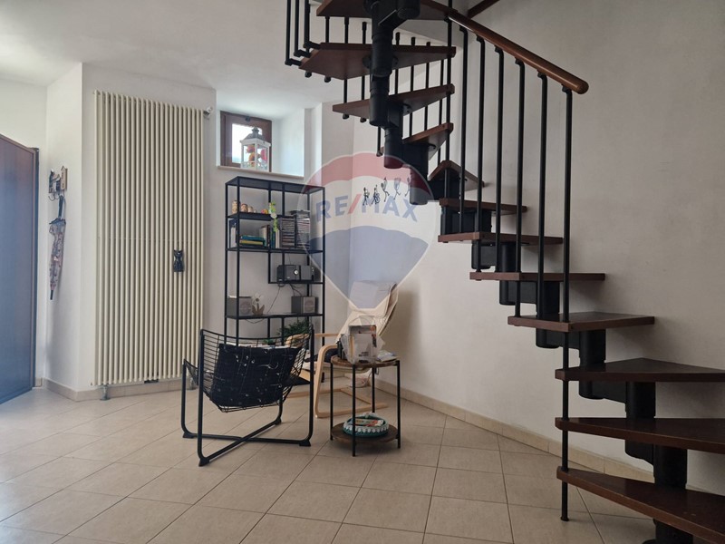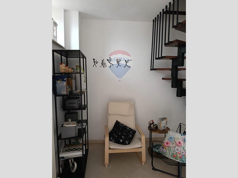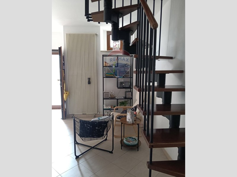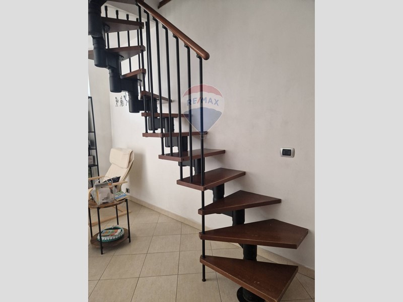 Attraverso una comoda scala interna si accede al primo piano, dove si trovano una spaziosa camera da letto, un bagno confortevole e un disimpegno con corridoio che porta al pianerottolo e alla scala esterna.