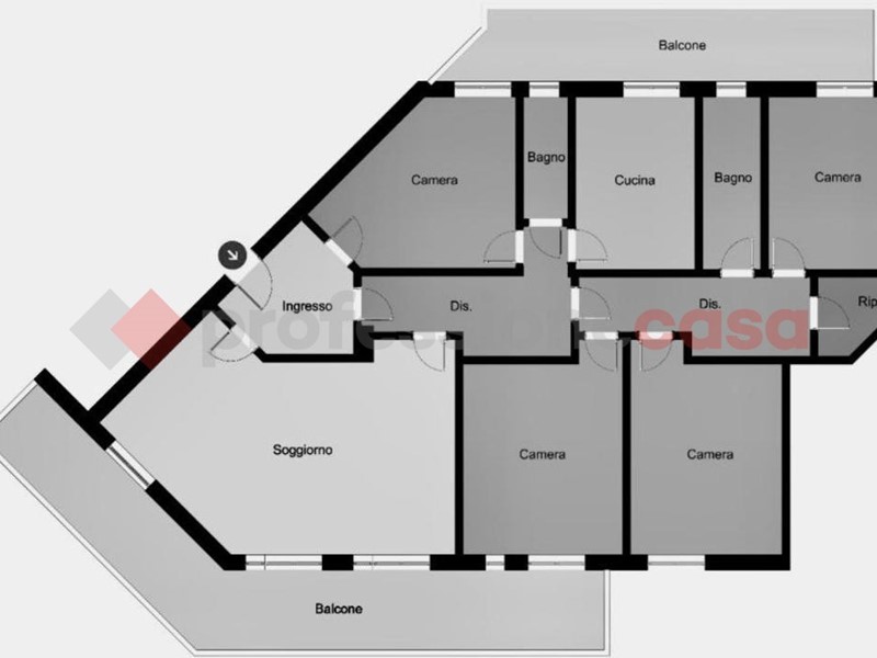 Si dispone con doppio salone angolare con 3 uscite su balcone con vista panoramica, 4 camere, cucina abitabile, 2 bagni, ripostiglio, 2 balconi, tripla esposizione.