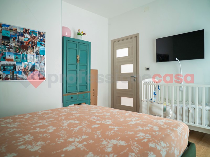 La soluzione si compone di: ingresso, salone living con cucina a vista e doppio punto luce, due camere da letto (di cui una con raffinata cabina armadio), bagno dal design moderno, pratico ripostiglio e balcone terrazzato.