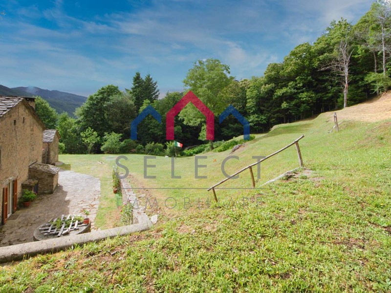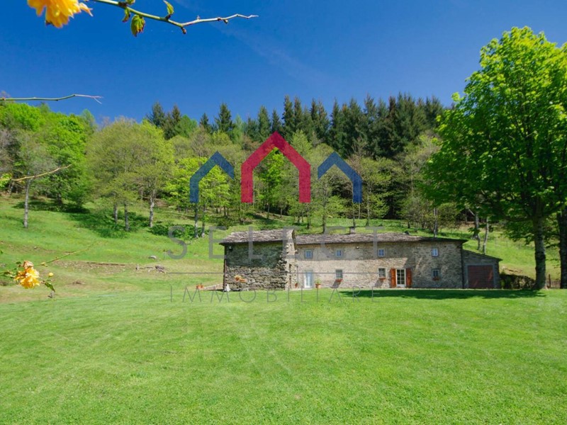 Una bellissima casa di montagna dell800 con sasso a vista, ed un giardino pianeggiante arredato e in parte lastricato in sasso, una conca a gradoni disposti ad anfiteatro tutta piena derba con a fianco la coltivazione di ortensie blu.