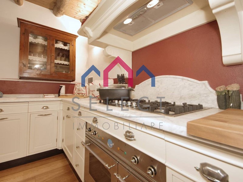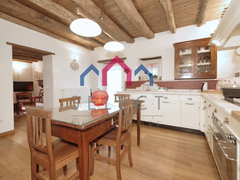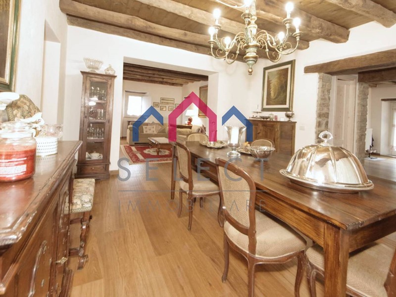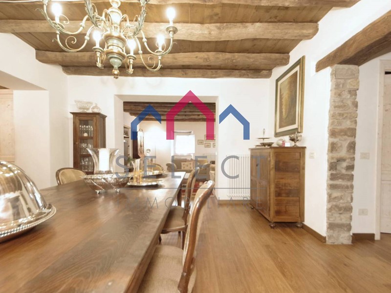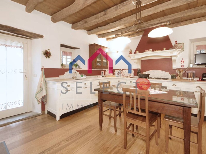 Il piano terra accoglie gli spazi dedicati alla vita quotidiana, con una sala da pranzo luminosa, un accogliente salotto con camino, una cucina attrezzata e un salottino riservato ai momenti di relax. I pavimenti in legno, posati a mano con cura artigianale, aggiungono un tocco di rusticità e carattere, trasmettendo un senso di calore e familiarità. Il piano superiore ospita tre ampie camere da letto mansardate, due bagni spaziosi e un locale dedicato al cinema domestico, completo di connessione internet ad alta velocità.
