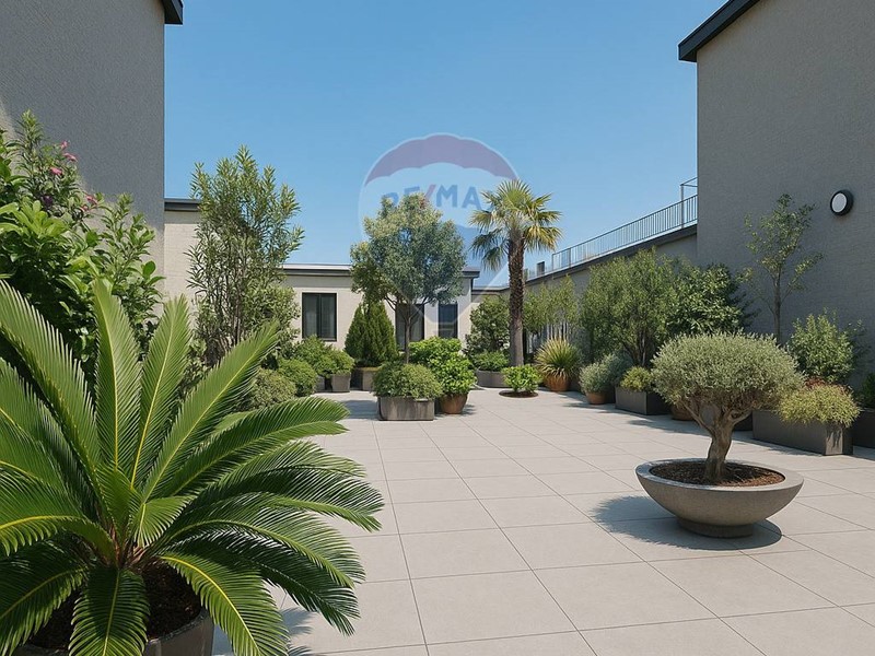 Il terrazzo è servito da un impianto di irrigazione automatica e regala una vista impareggiabile sullo skyline di Milano: da Porta Nuova alla Torre Unicredit, dal Palazzo della Regione fino al celebre Bosco Verticale.