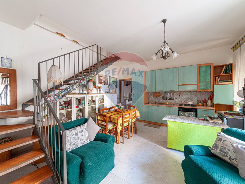 Piano inferiore: zona living con cucina a vista, cameretta, bagno completo con doccia, comodo ripostiglio e vano scala interno;