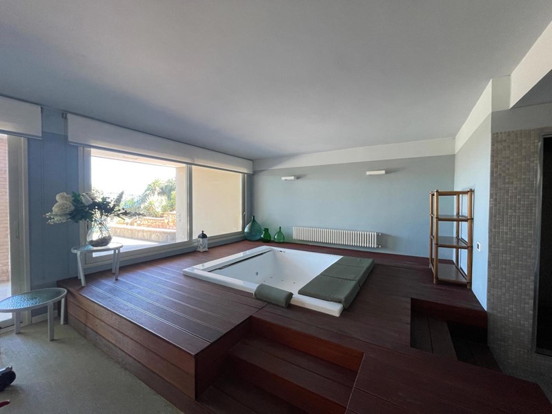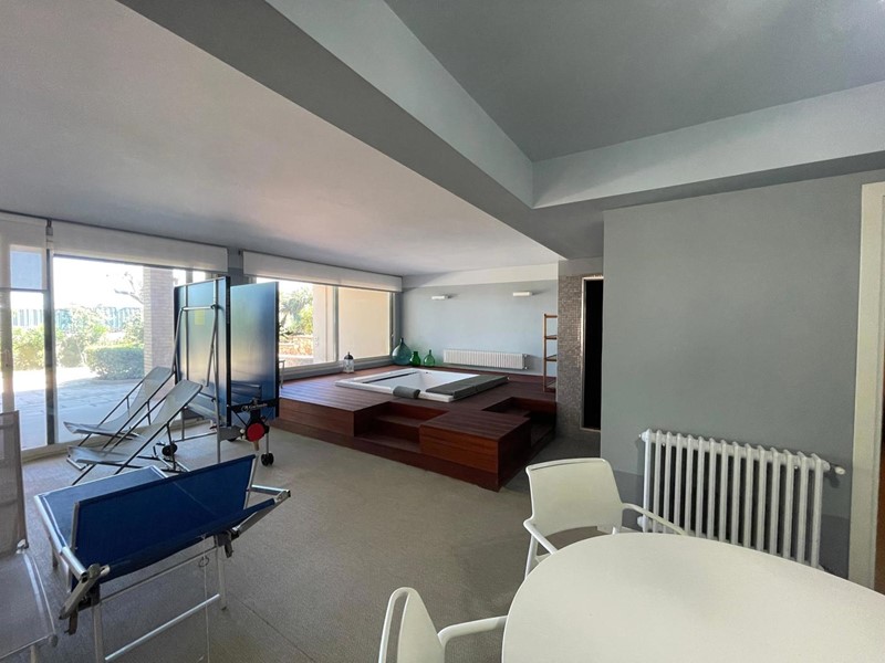 -	Piano livello giardino/mare composto da bagno turco, idromassaggio, ampia zona relax, spogliatoio con bagno, tavolo pingpong, 1 camera da letto (servizio) con bagno (doccia), locali tecnici, lavanderia con bagno di servizio, solarium, giardino, accesso diretto alla spiaggia.