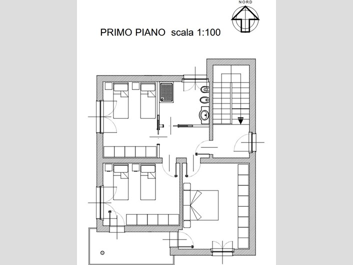 Piano primo: tre ampie camere matrimoniali due delle quali dotate di comodo terrazzo, disimpegno ed un bagno molto grande, finestrato, pensato per garantire il massimo comfort alla zona notte.