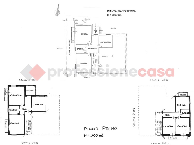 L'appartamento posto al lato est del fabbricato è composto di ingresso, cucina abitabile, due camere da letto e bagno, il tutto distribuito su una superficie di circa 85 mq oltre la cantina posta al piano seminterrato; Gli appartamenti del primo piano si prestano favorevolmente a costituire un'unica soluzione abitativa, non necessitando di particolari costi in opere murarie, offrendo così un luminoso ingresso, ampia cucina, sala, quattro camere da letto e doppi servizi, il tutto su una superficie di oltre 190 mq.