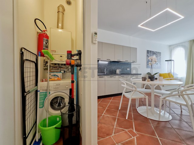 L'ingresso si apre su una luminosa zona giorno con cucina a vista in open-space , un comodo ripostiglio/vano caldaia e lavatrice.