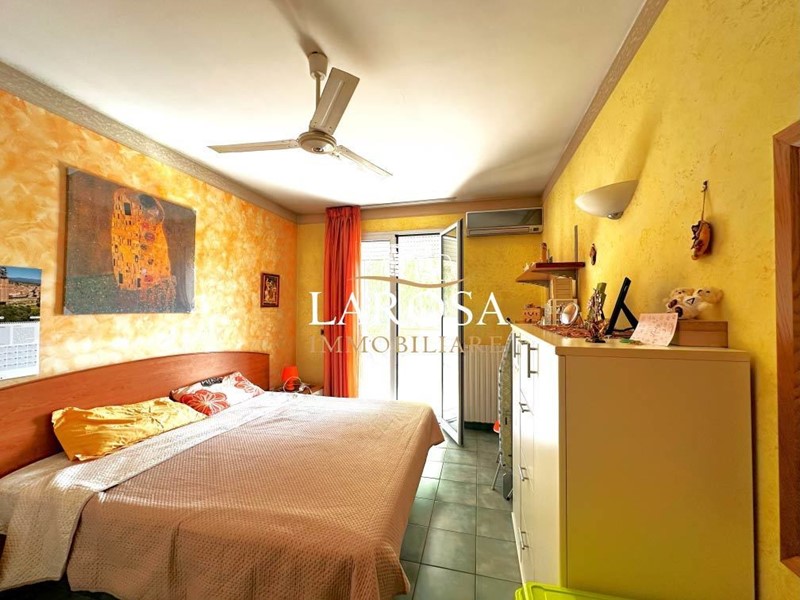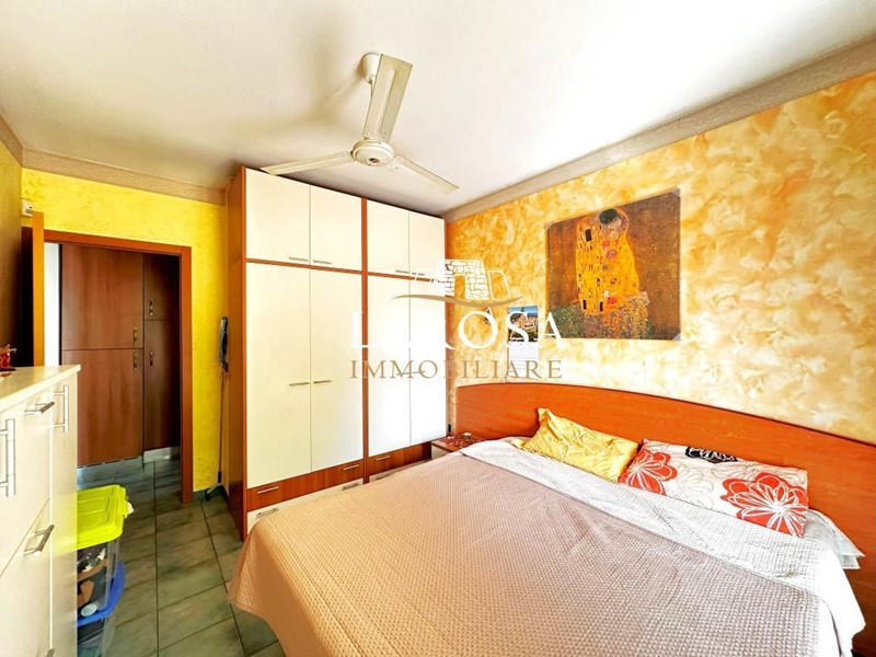 La zona notte comprende una camera da letto matrimoniale, anch’essa con affaccio diretto sul balcone, e un bagno finestrato completo di doccia, lavabo e servizi.