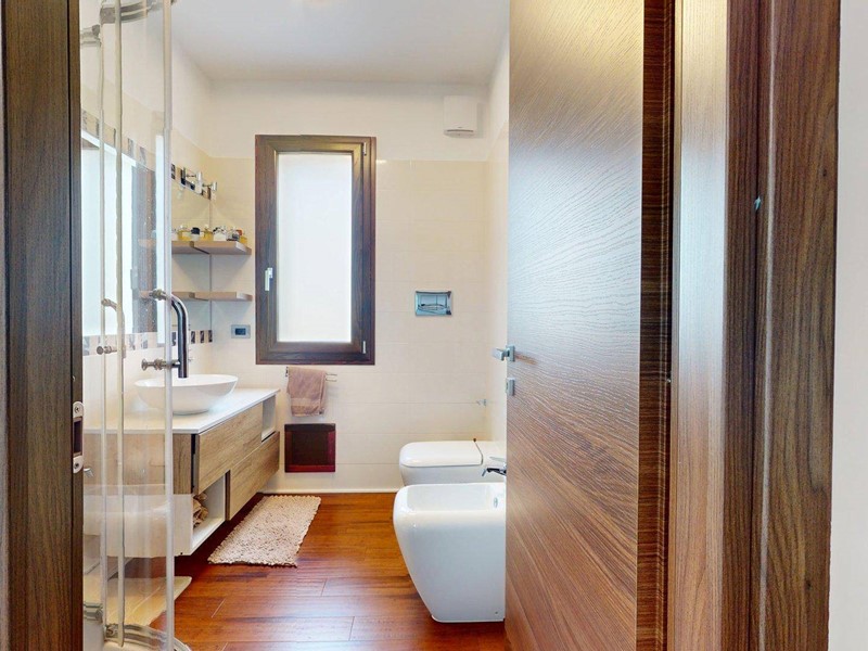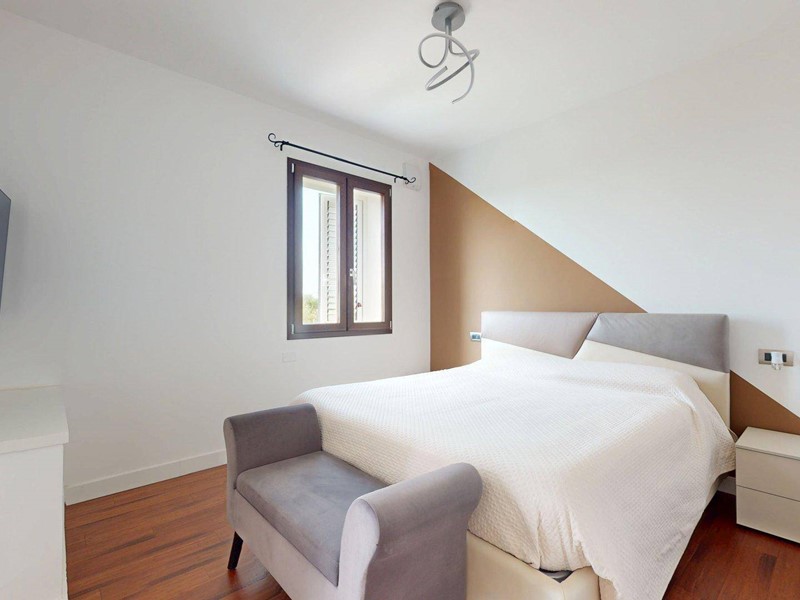 La zona notte, situata al piano superiore, è oggi composta da due ampie camere matrimoniali di generose dimensioni. Originariamente tre, le stanze sono state ripensate e ridistribuite: due camere sono state fuse per creare ununica, straordinaria matrimoniale doppia, che regala spazi ariosi e un comfort superiore. A completare il piano, un secondo bagno con doccia arricchito da finiture di pregio.