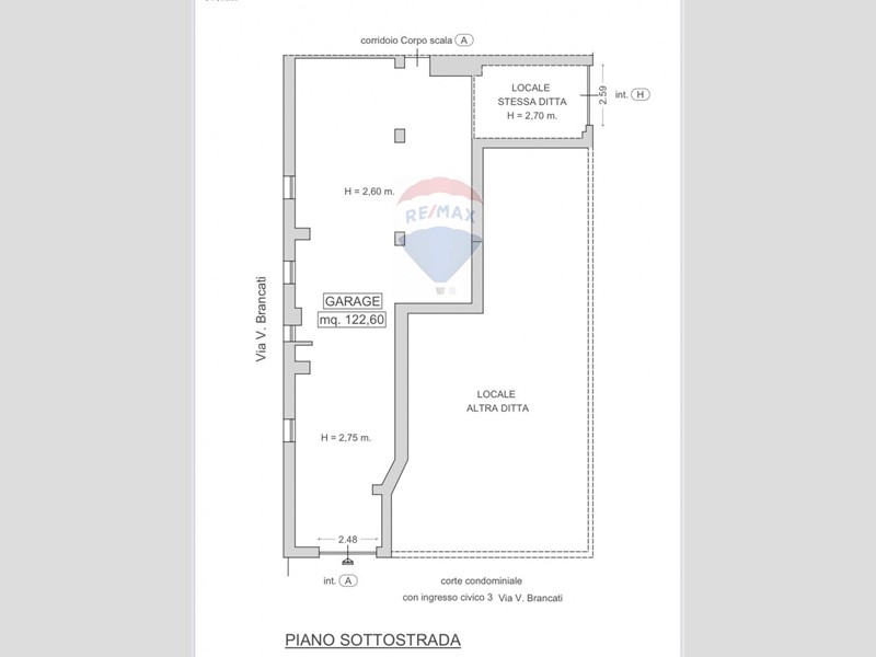 Accesso ingresso largo 2,48 m altezza 2,20 circa.Apertura con saracinesca.