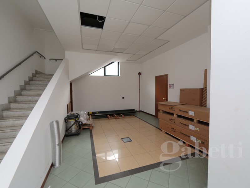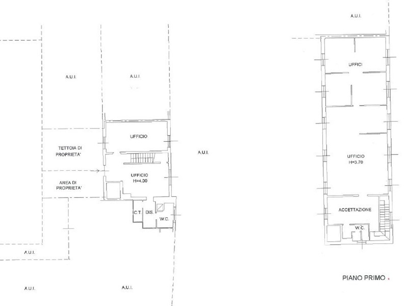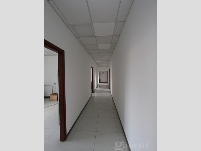 Il primo piano, di circa 250mq, ospita un locale disimpegno, ulteriori servizi e 6 uffici di diverse metrature, l'ampia superficie consente di adattare gli spazi alle diverse necessità.