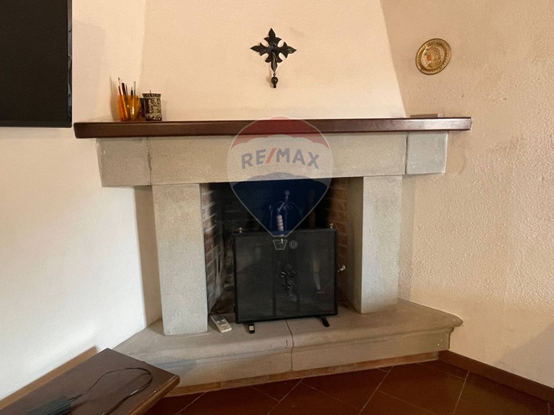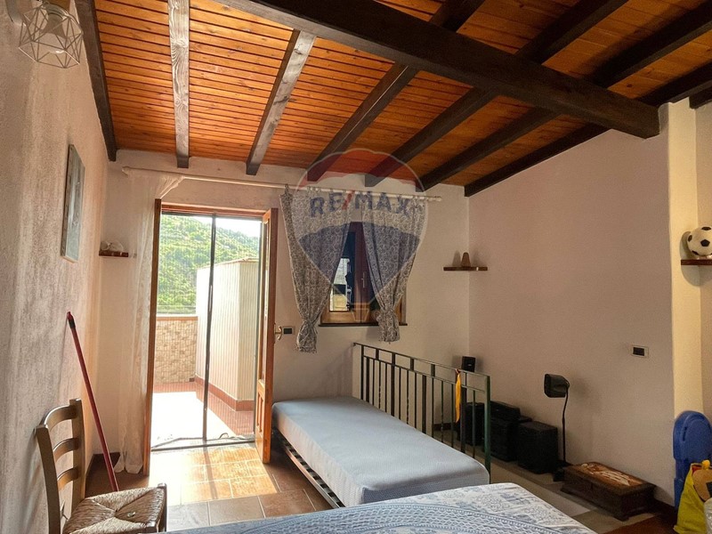 Al piano superiore, una zona giorno luminosa con caminetto e accesso a un terrazzino panoramico con vista aperta sui monti circostanti e scorci di mare perfetto per rilassarsi allaperto.