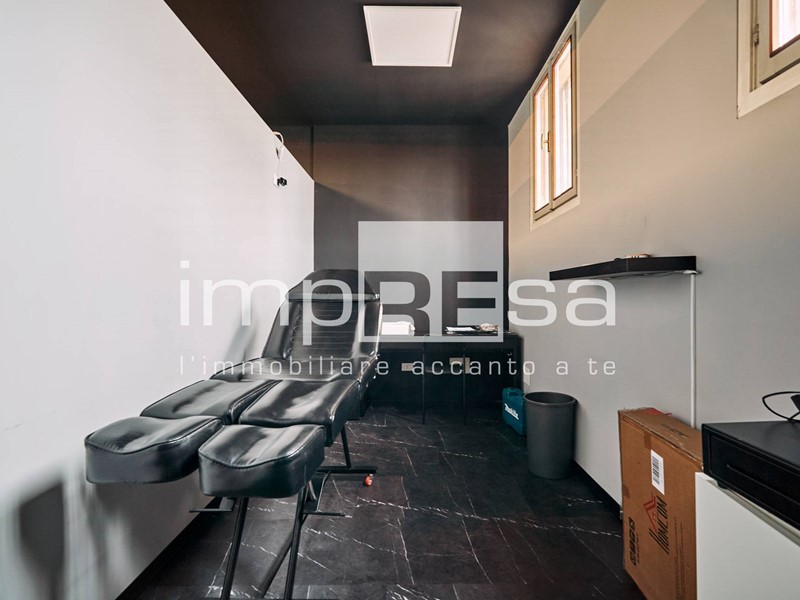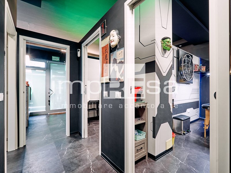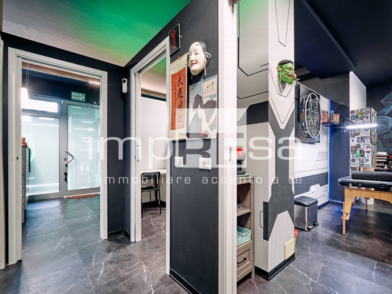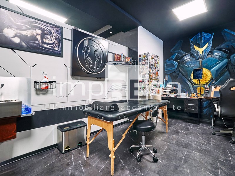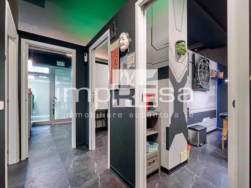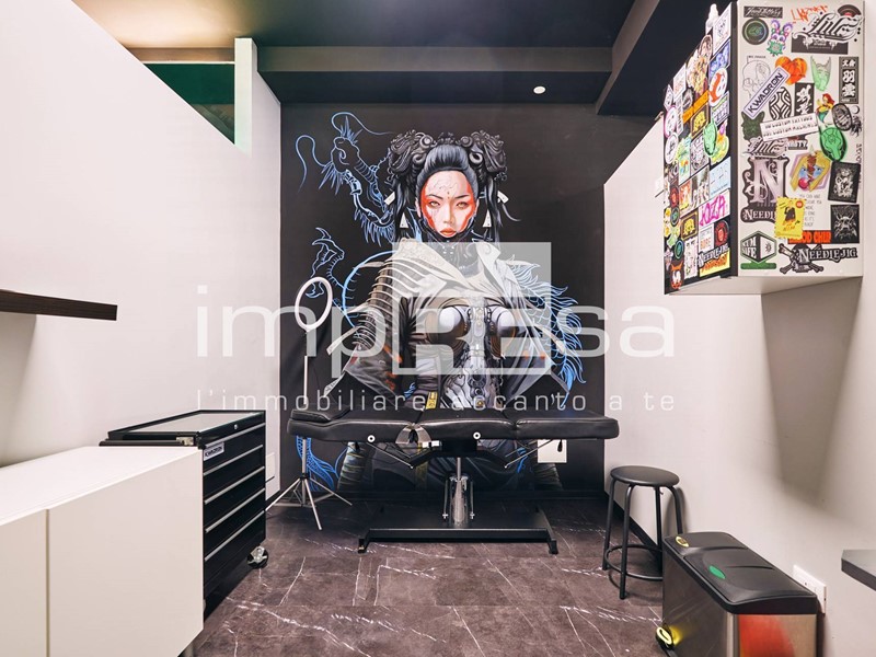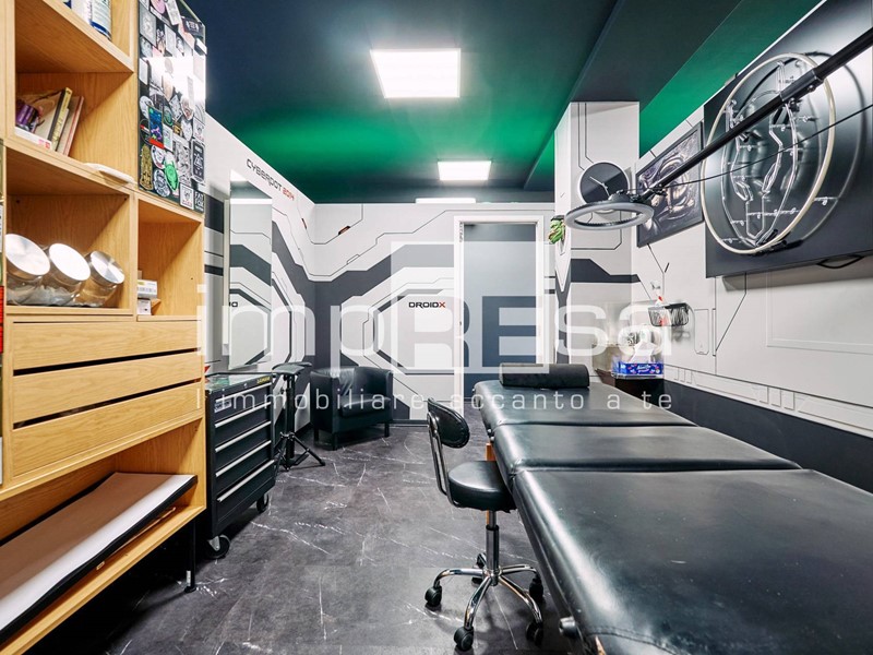 Il negozio si sviluppa nel seguente modo: l' ingresso dà su una comoda reception per l' accoglienza degli ospiti, tre sale operative ricavate con pareti in cartongesso, un bagno con anticamera e una saletta ad uso magazzino per il personale.