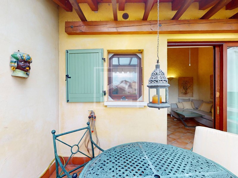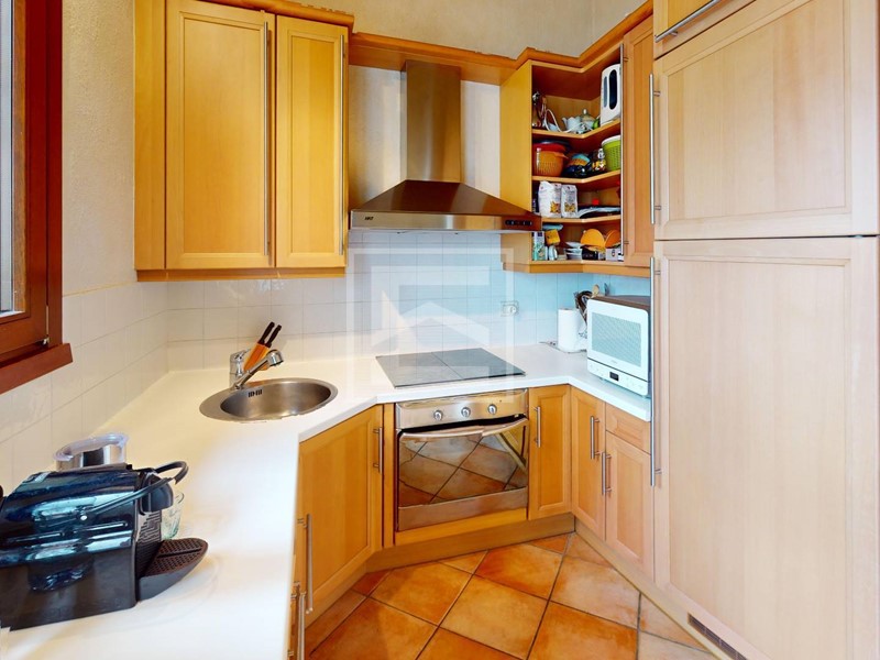 La terrazza è attrezzata con barbecue, ideale per pranzare all'aperto e godersi la bella stagione. La cucina su misura è separata dalla zona giorno.